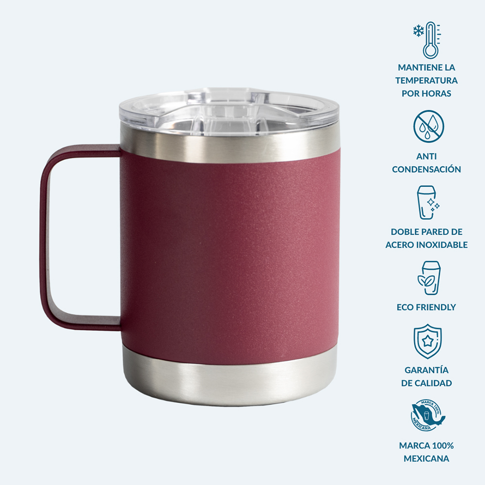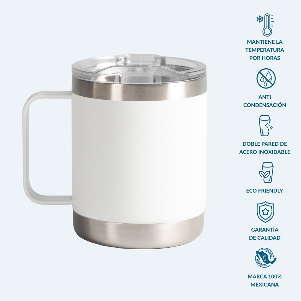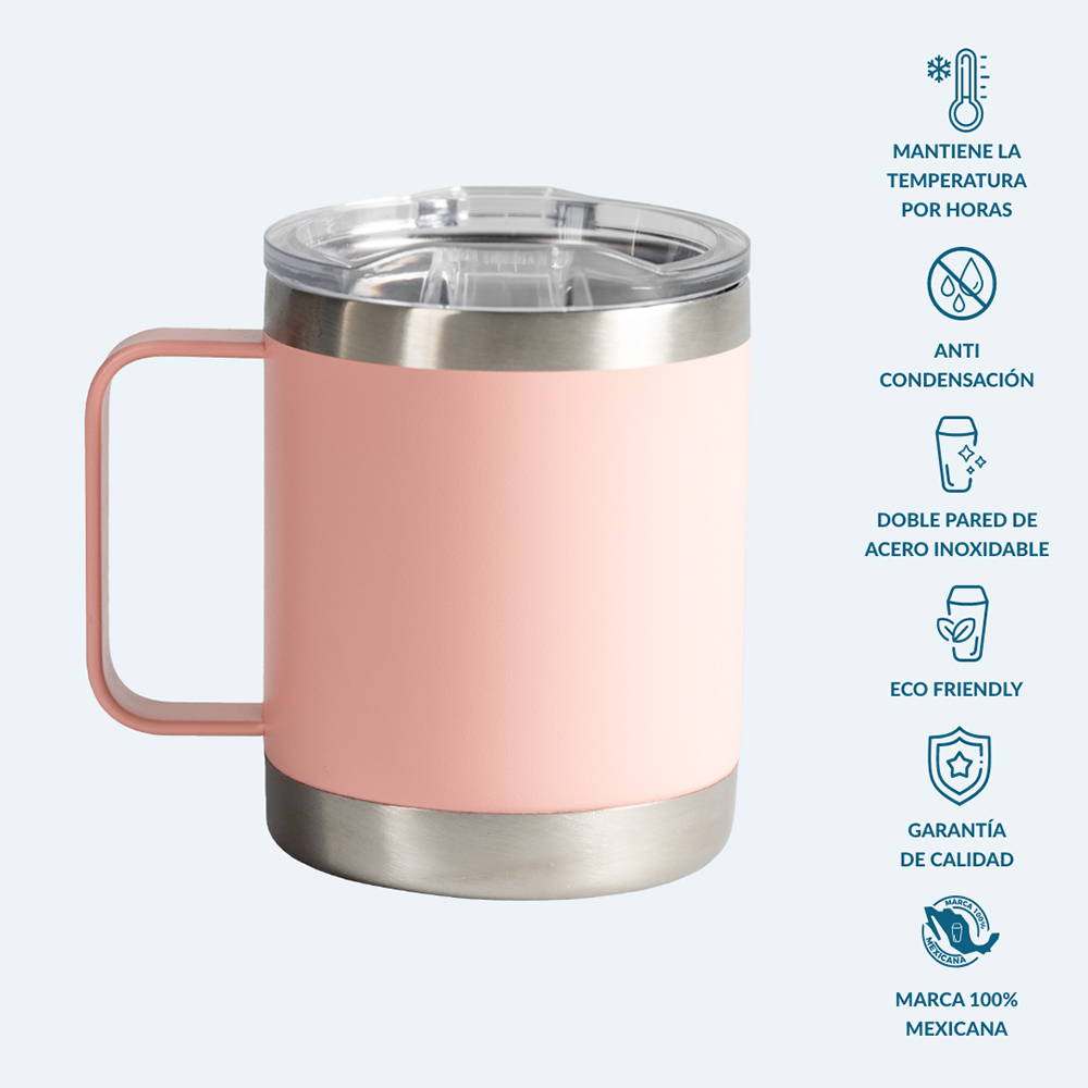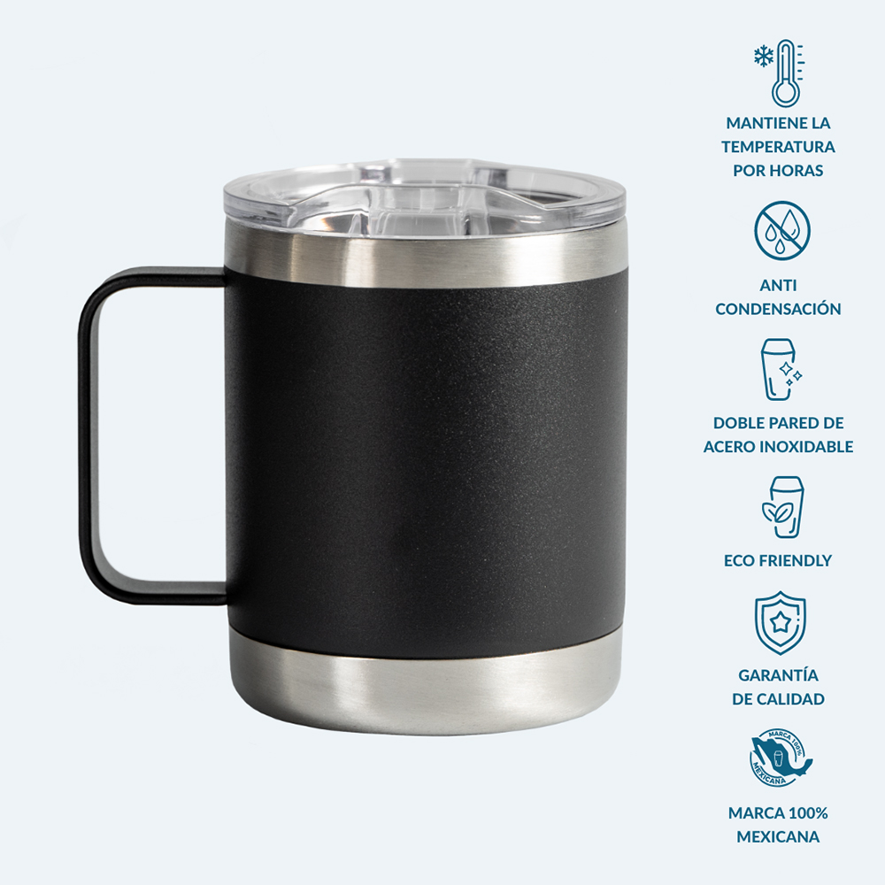 TAZA 12 oz Taza de acero inoxidable con grado cocina libre de BPA, cuenta con una doble pared grado 18/8 anti condensación, la cual permite mantener la temperatura ideal de tu bebida hasta el último trago, aislando el calor y el frío del ambiente. Su composición de alta calidad lo vuelve resistente a la perforación y corrosión. Producto de fácil lavado, permitido en lavavajillas. Capacidad 355 ml.