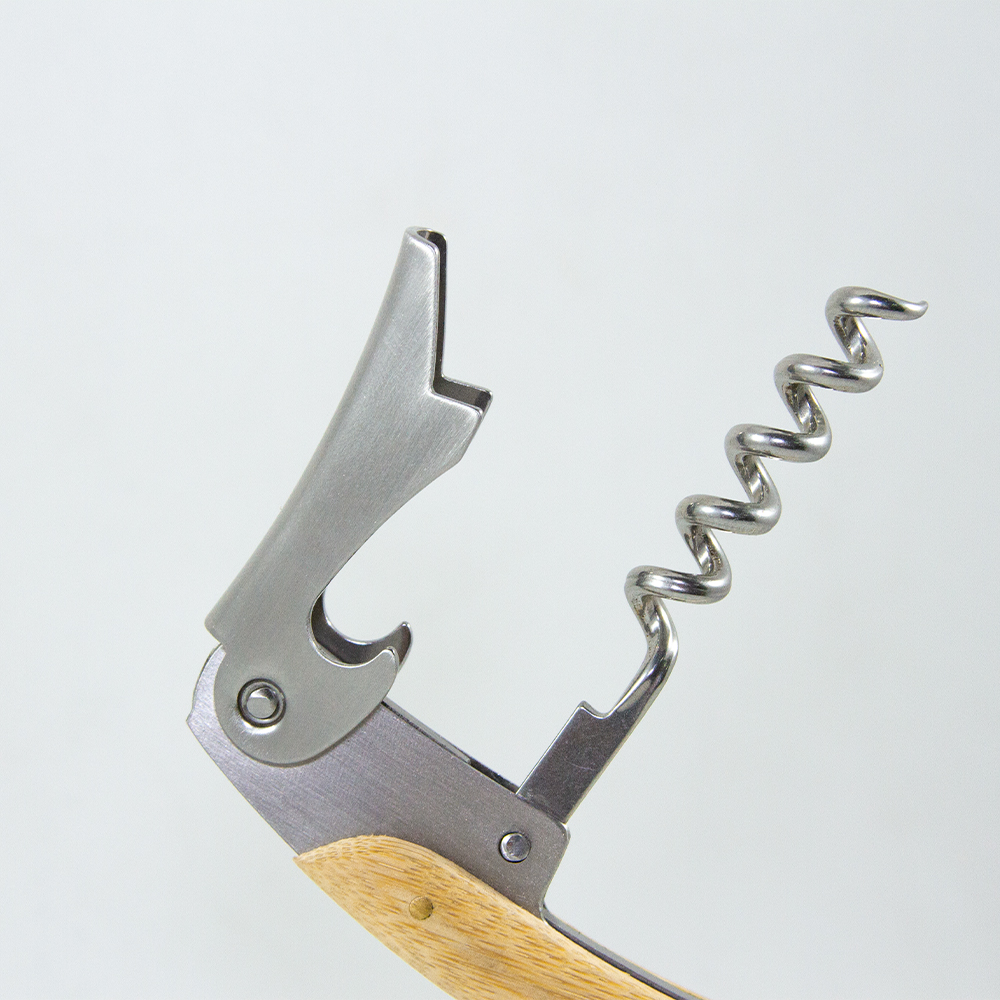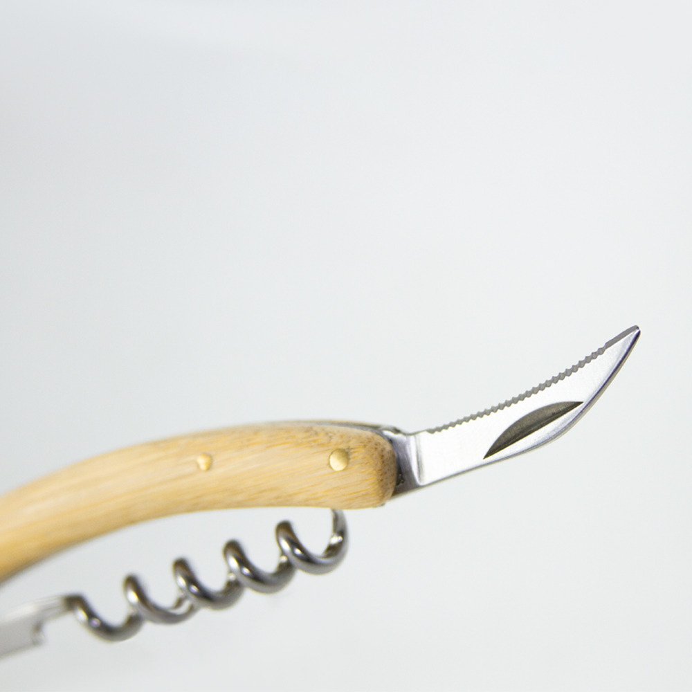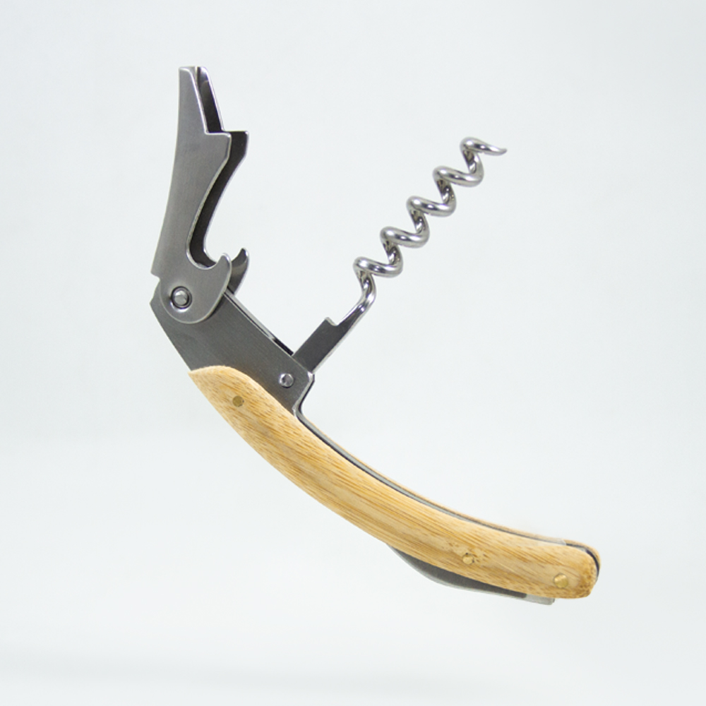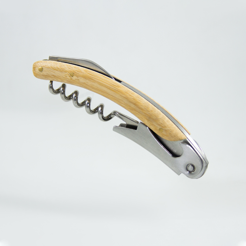 JEREZ. Sacacorchos metálico que incluye destapador y navaja, con cubierta de bambú.