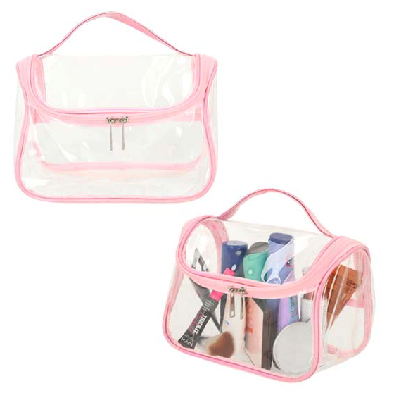 LUCY Cosmetiquera de plástico transparente, costuras en color rosa, doble cierre y asa.