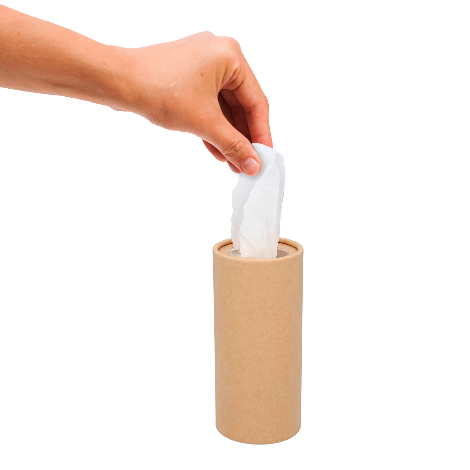 TEAR Caja con 60 pañuelos desechables con forma cilíndrica.