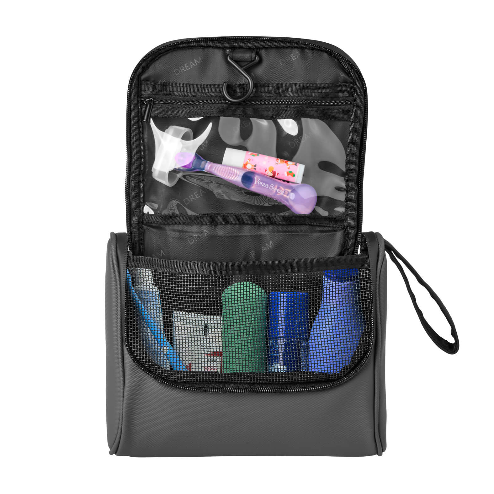 TONY Estuche de viaje de plástico con un compartimento principal, malla interna, un compartimento transparente en la parte superior con cierre, gancho y asa