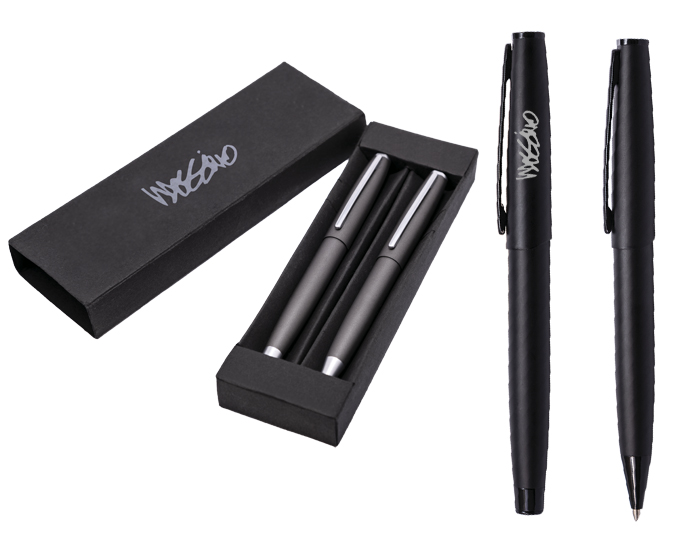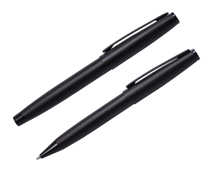 TWAS - Set de bolígrafos metalicos. Un bolígrafo de punto fino tipo roller con tapa y otro bolígrafo con mecanismo retráctil con clip metálico. Presentación: caja en color negro.