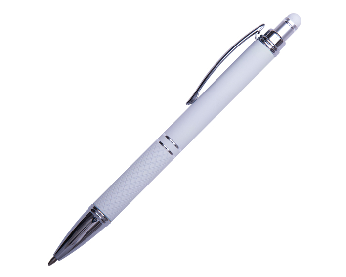 STEVIA DE TINTA AZUL - Bolígrafo de aluminio de tinta azul, con recubrimiento de goma, parte inferior con textura. Detalles y clip metálico. Punta touch y mecanismo de click.