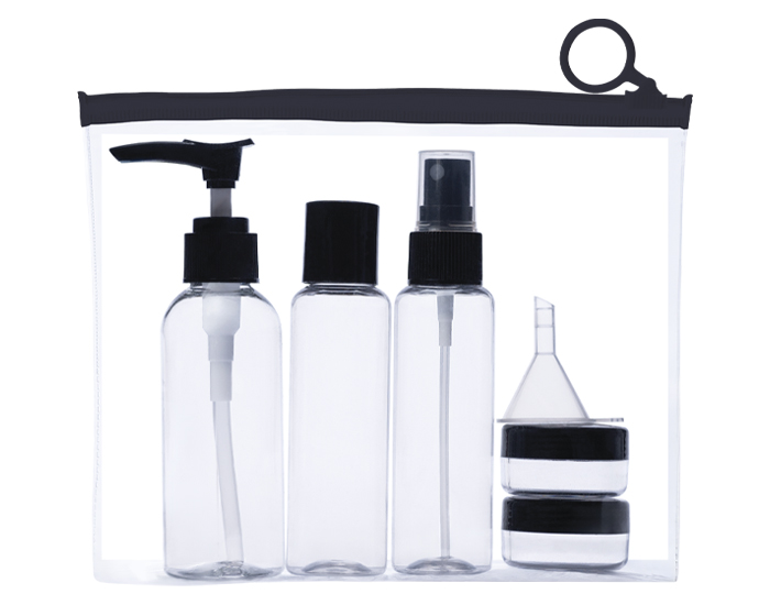 QIRA - Set de contenedores para viaje incluye un contenedor despachador (80 ml), Contenedor con atomizador (60 ml), Contenedor (60 ml), Dos contenedores para crema (10 ml) y un embudo. Estuche transparente con cierre.