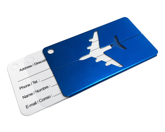 VUELO - Identificador de equipaje de aluminio con detalle de avión. Cuenta con una pulsera con seguro giratorio hecho de alambre galvanizado recubierto de PVC y una tarjeta para datos personales (español/inglés) con mica protectora.