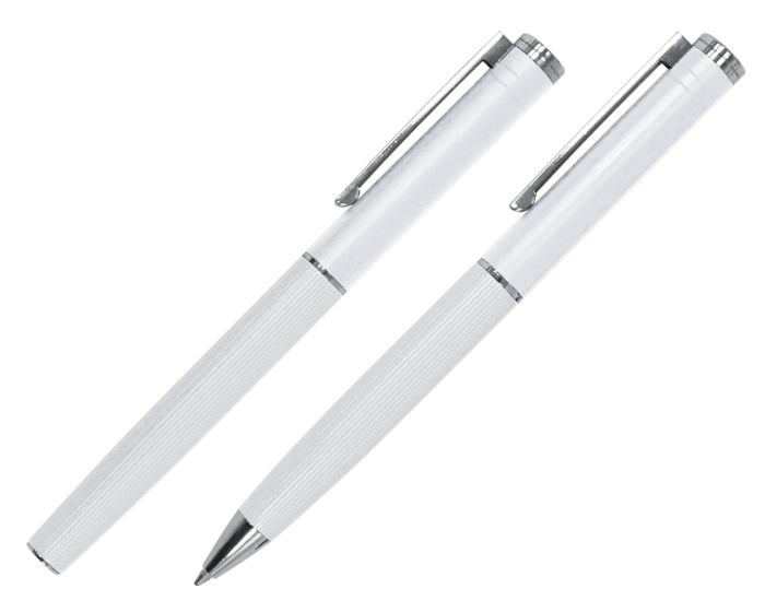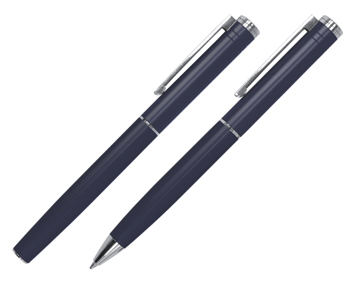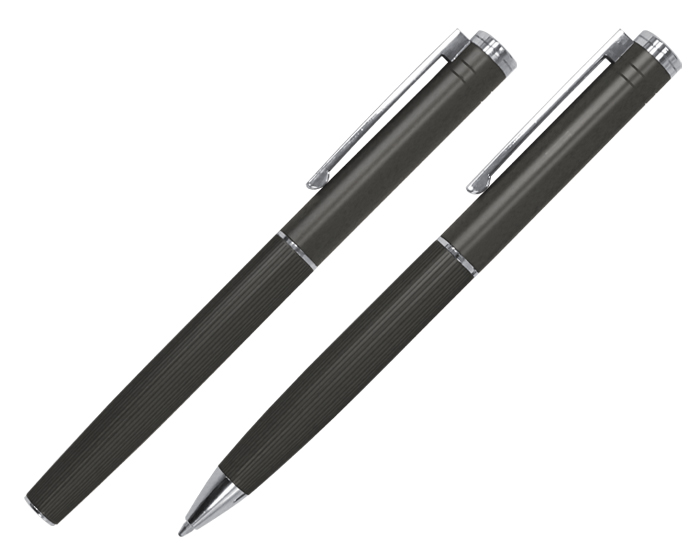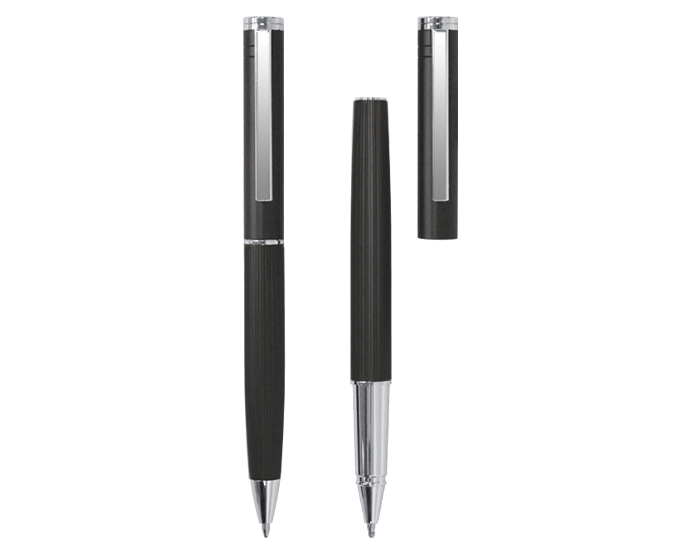 MOZART - Set de bolígrafos metálicos, lisos en su parte superior y con una sutil textura de líneas verticales en su parte inferior; esmaltado mate con detalles en color plata en el centro, extremos y clip. Un bolígrafo es tipo roller y el otro es con sistema retráctil. Cuenta con repuesto metálico. Presentación: caja de regalo color negro.