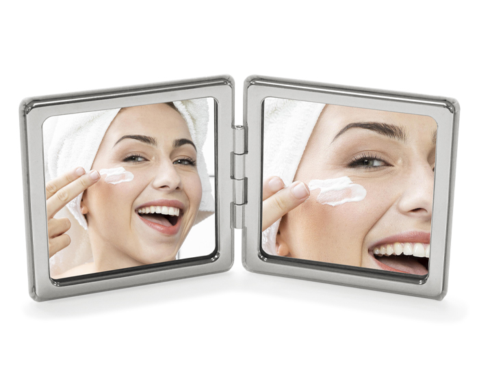 GLAMOUR - Espejo doble 1X/2X, con cierre magnético, tapas forradas en PU y detalles en cromo.