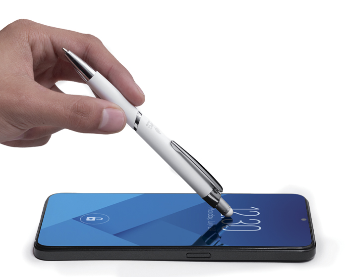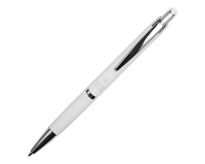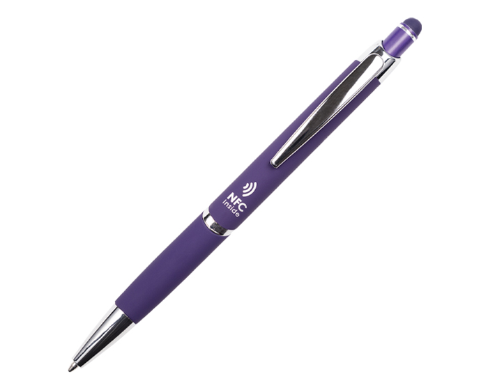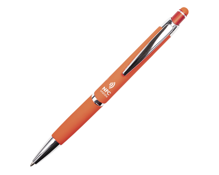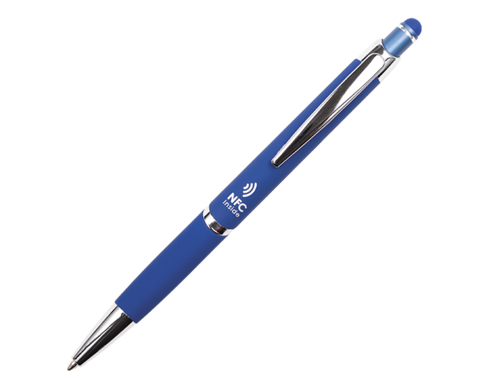 ZANTY - Bolígrafo de aluminio con acabado de goma suave al tacto y detalles en cromo. Cuenta con touch screen en la parte superior del color del bolígrafo y mecanismo de click. Al grabar destapa en color plata. Repuesto en tinta negra alemana de 1 mm. Tiene una etiqueta NFC en su interior que enlaza la información rápidamente a la aplicación de NFC, compatible con todos los celulares Android e iOS que cuenten con esta aplicación disponible.