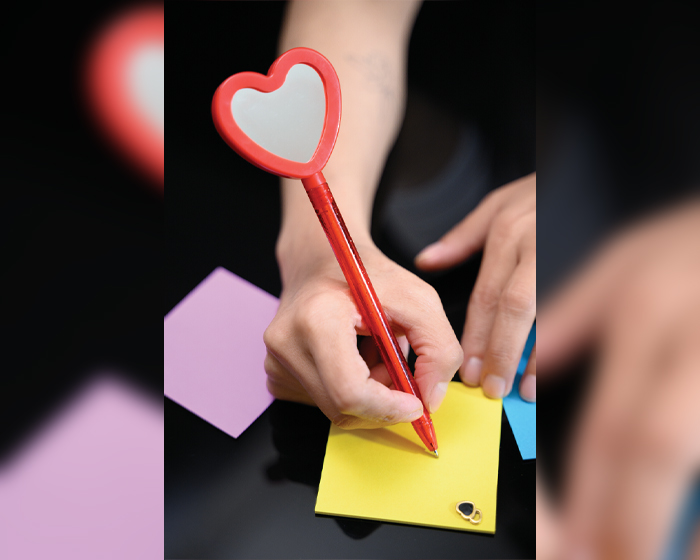 LATIDO - Bolígrafo delgado de plástico traslucido con cuerpo de glitter y forma de corazón con espejo.