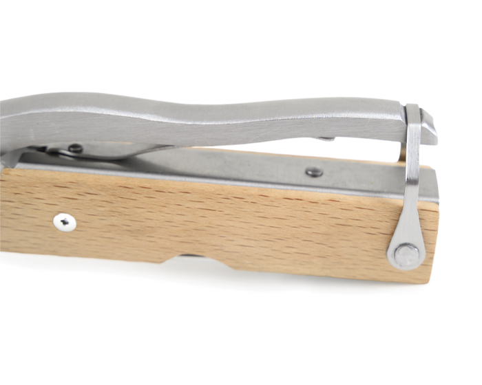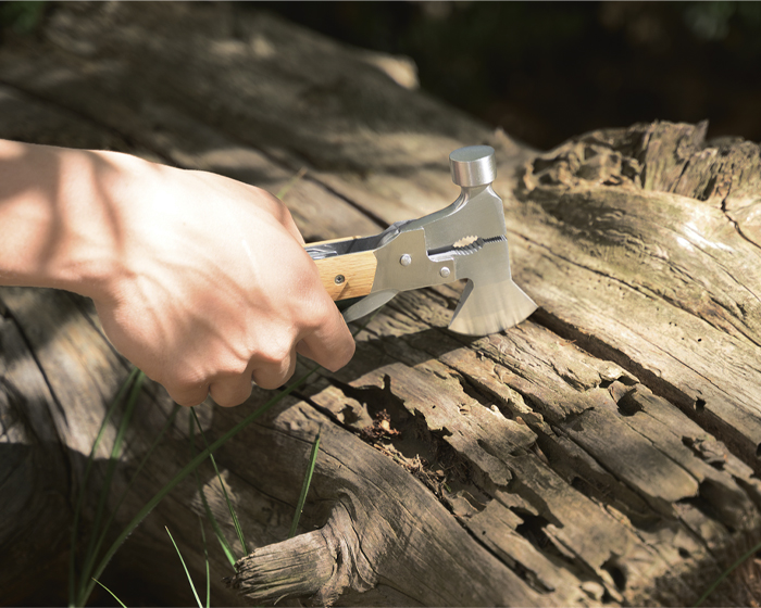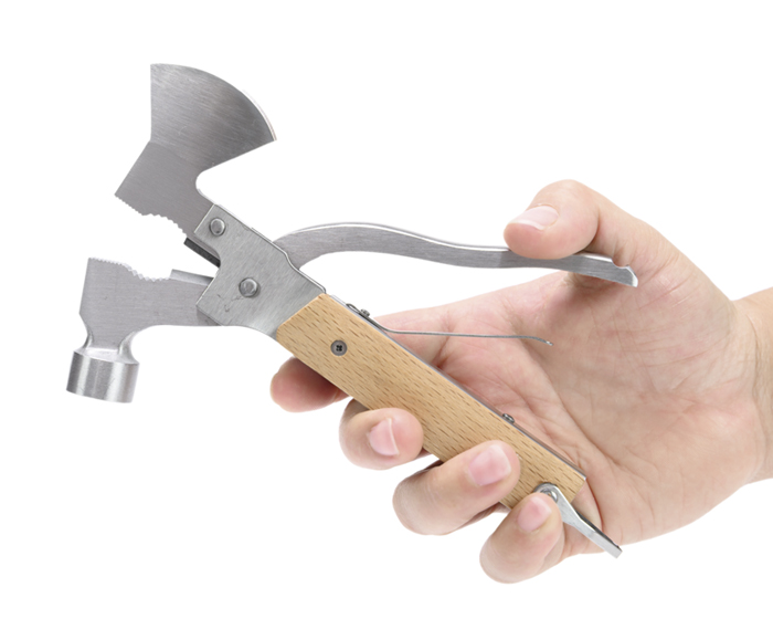 LEÑADOR - Multi herramienta plegable tipo martillo con mango de madera y 14 funciones: Hacha, alicatas redondas, alicatas planas, martillo, navaja de sierra con lima, desarmador plano pequeño, destapador de botellas, llave múltiple, desarmador plano grande, descamador de pescado, desarmador de cruz, navaja, cortador de alambre y arillo para colgar. Presentación: caja de regalo a color.