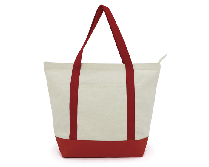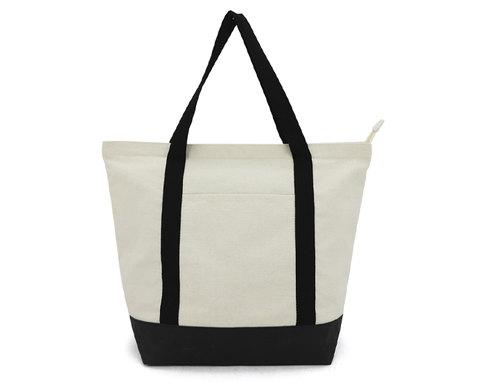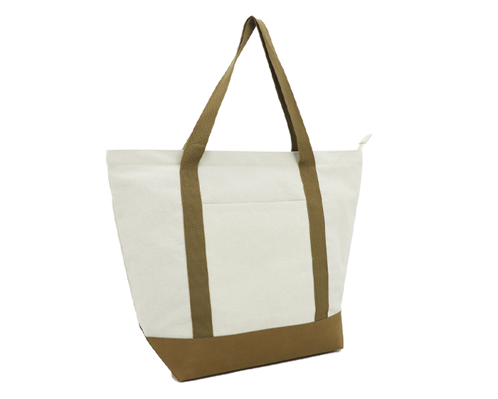 TULUM - Bolsa cosida de poli algodón con base de kraft, cuenta con un compartimento principal con cierre, bolsillo interno con cierre y bolsillo frontal externo. Incluye base y 2 asas de algodón del mismo color.