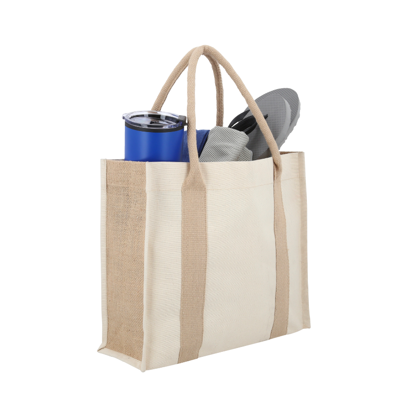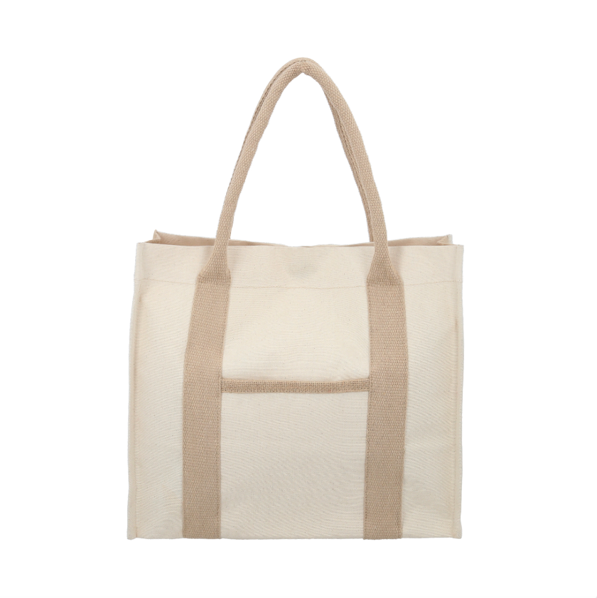 SICILIA Bolsa de loneta con yute, 1 compartimento con bolsa frontal, broche magnético, fuelle y asas.