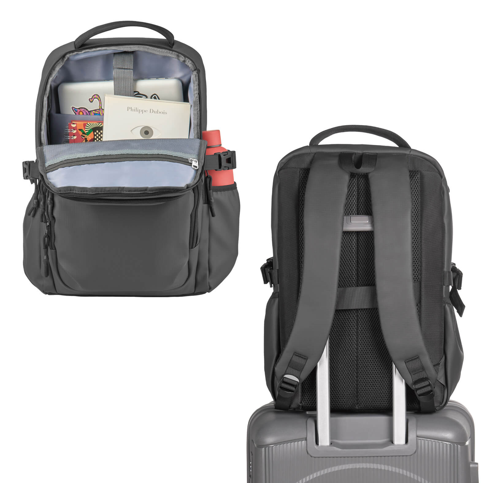 CHARCOT Mochila con compartimento principal con porta laptop de 17", malla interna, broches laterales, dos bolsas frontales con cierre, dos bolsas laterales con elástico, respaldo acolchado con banda carry-on y asa superior.