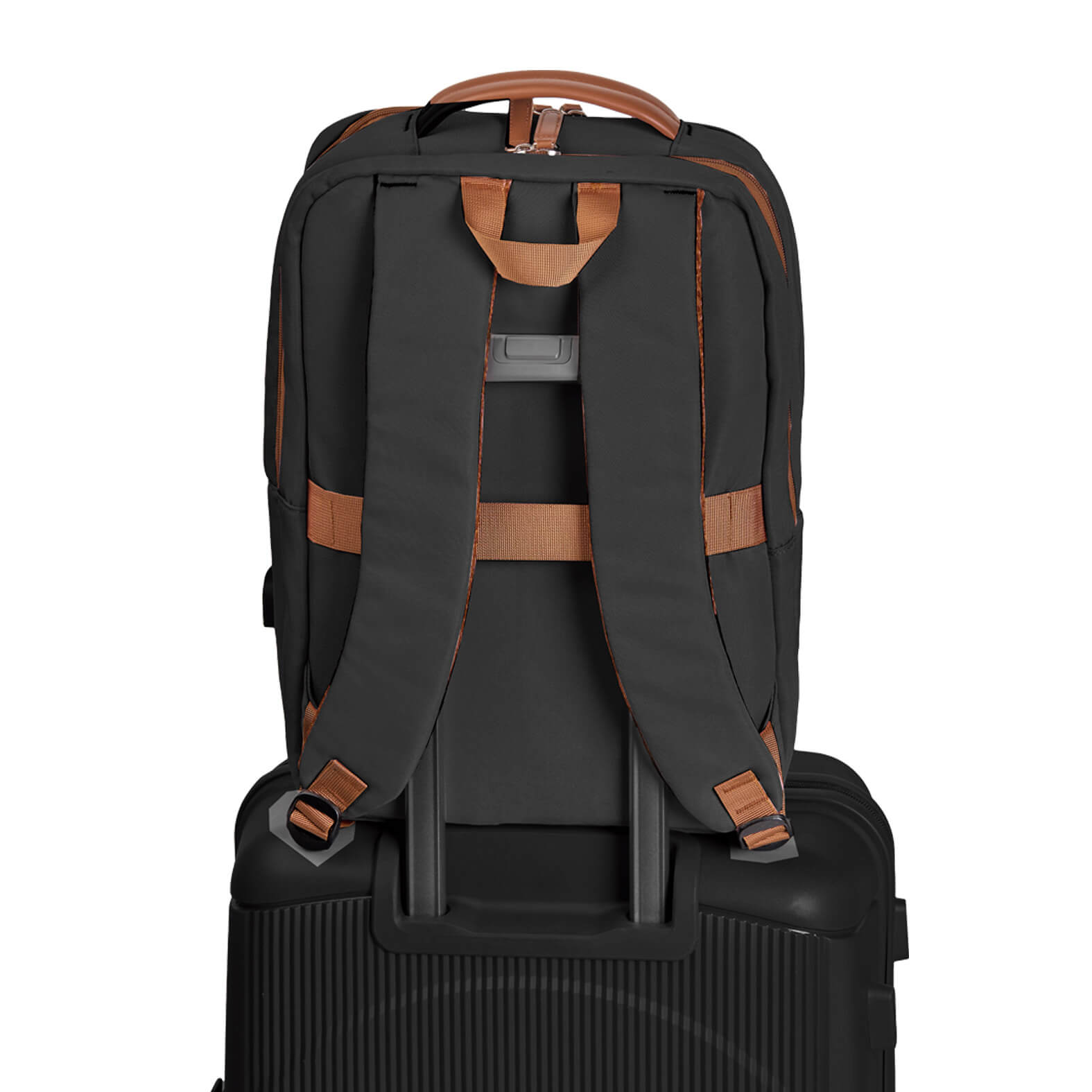 NORCIA Mochila con compartimento principal con organizador interno, puerto de carga USB, compartimento trasero para porta laptop de 16", banda carry-on, dos bolsas frontales con cierre, una bolsa lateral y asa superior.