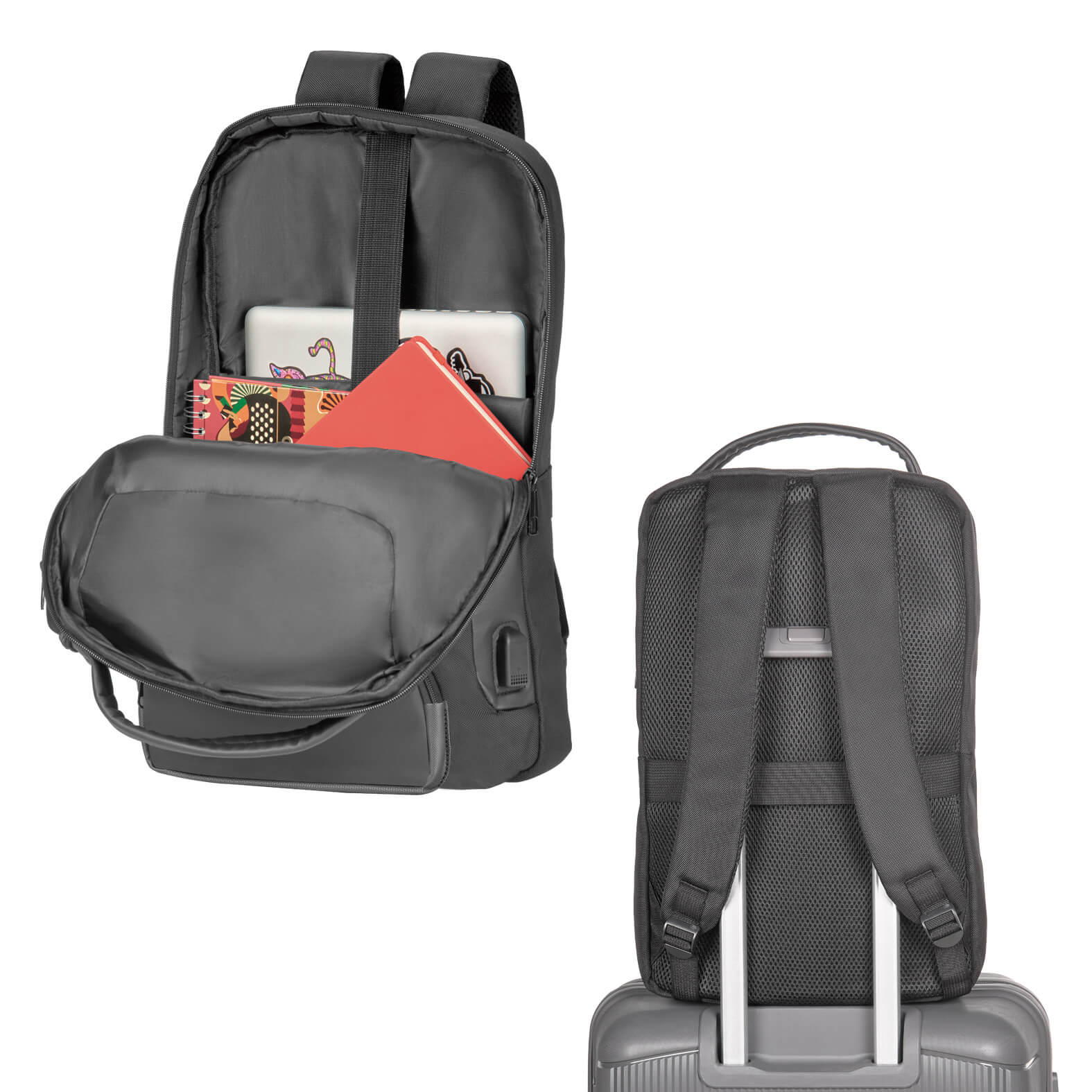 BARENTS Mochila con compartimento principal con porta laptop de 18" y candado de seguridad, una bolsa lateral con cierre, puerto de carga USB, tres bolsas frontales, banda carry-on en la parte trasera y asa superior.