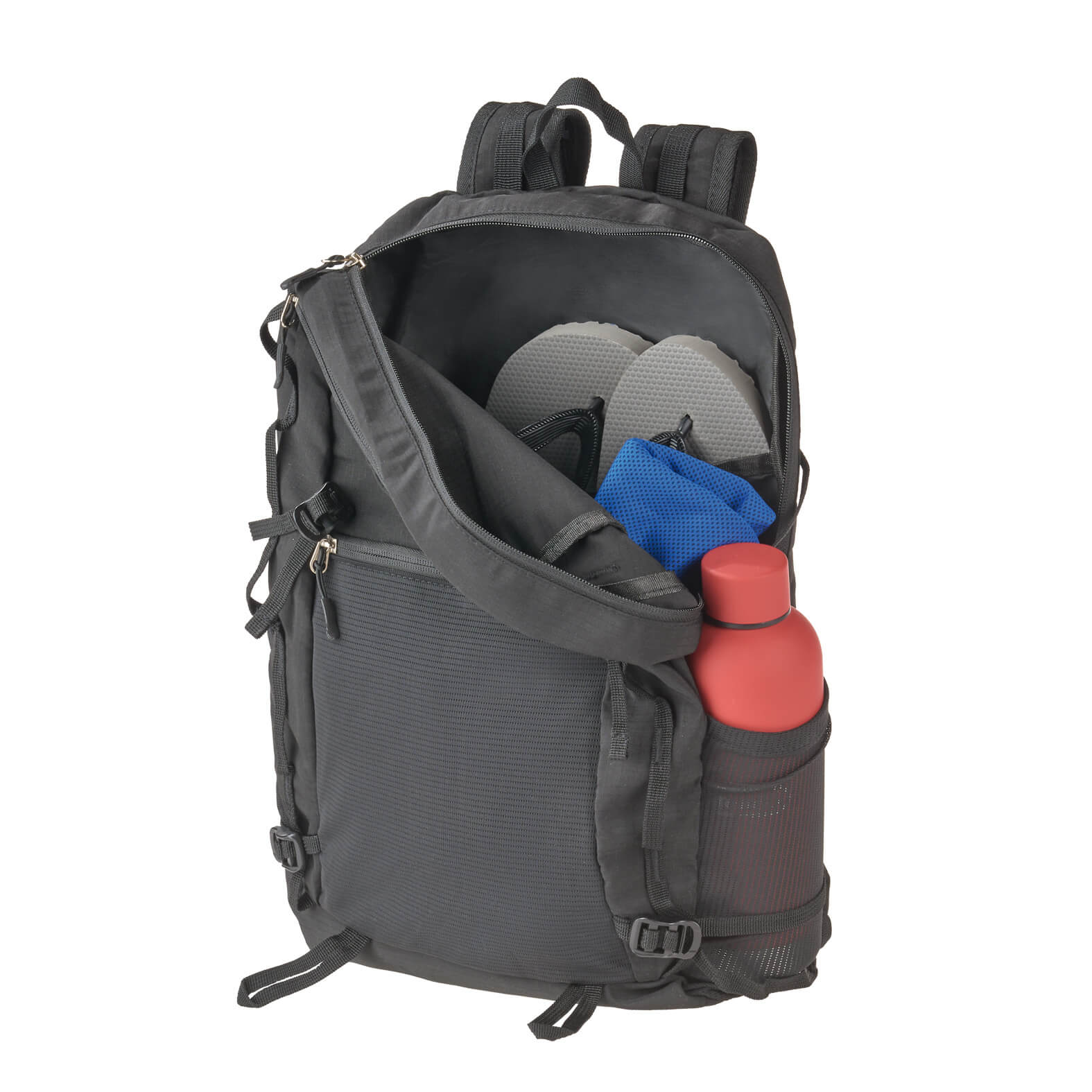 OBIDOS Mochila plegable con compartimento principal con porta laptop de 16", dos compartimentos frontales, dos bolsas laterales con elástico y tirantes con broches.