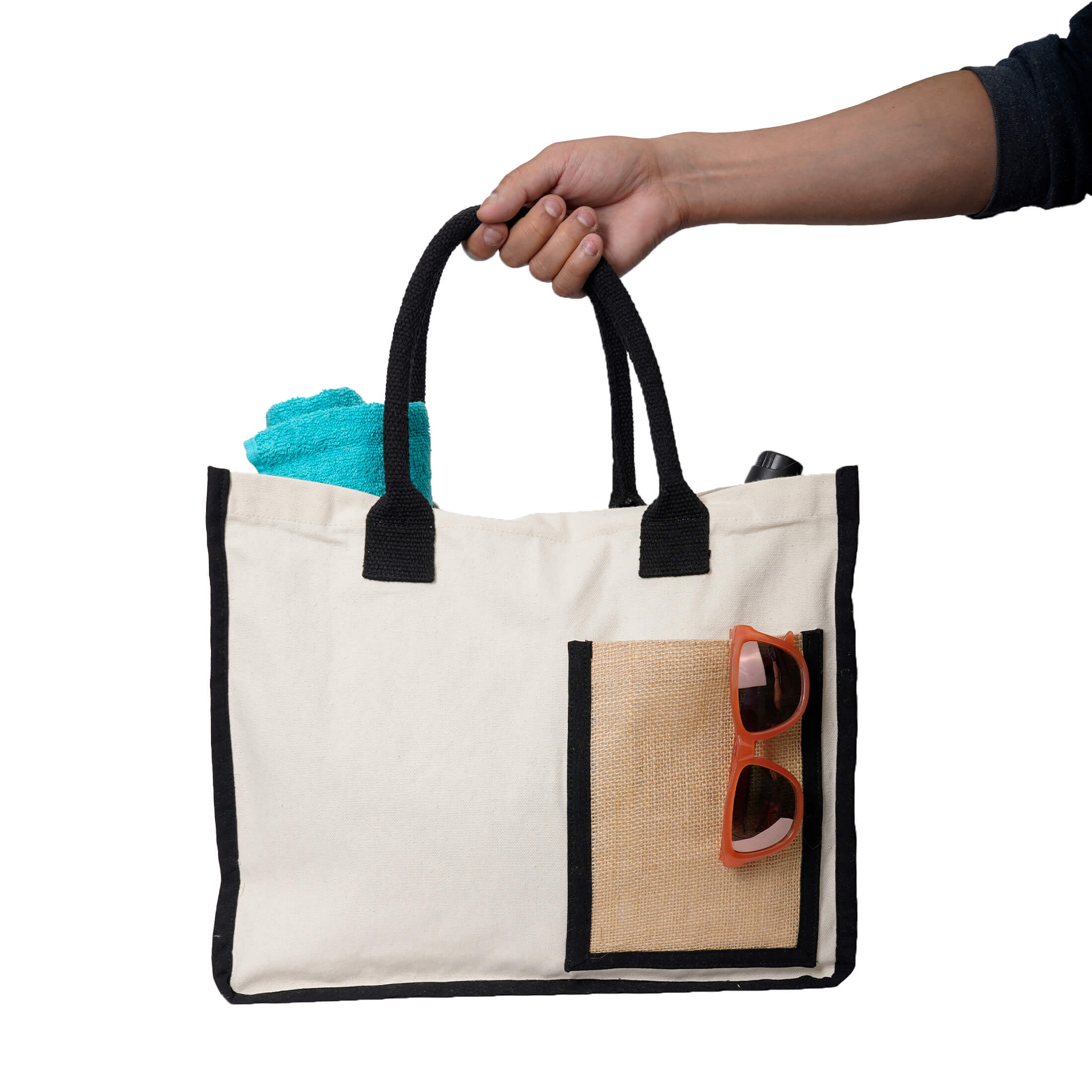 NAVAGIO Bolsa de algodón de 120 g/m², con resistentes asas cosidas y bolsillo frontal en yute natural de 320 g/m².