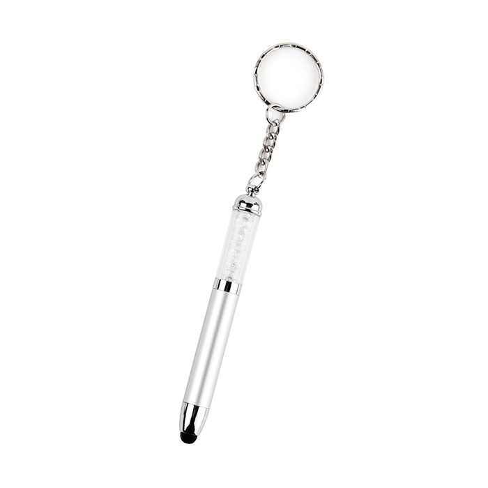 Bolígrafo mini llavero West. - Bolígrafo mini llavero con puntero touch y elegante detalle en piedras, con tinta negra. Compacto y práctico, perfecto para llevar a todas partes con estilo.