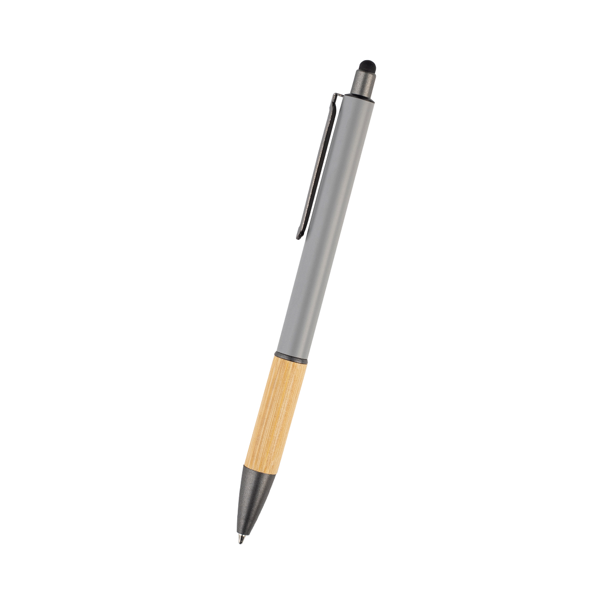 Bolígrafo Todi. - Bolígrafo con barril de aluminio y detalle de bambú en la parte inferior, clip y punta metálicos, con touch en la parte superior. Tinta de gel escritura azul.