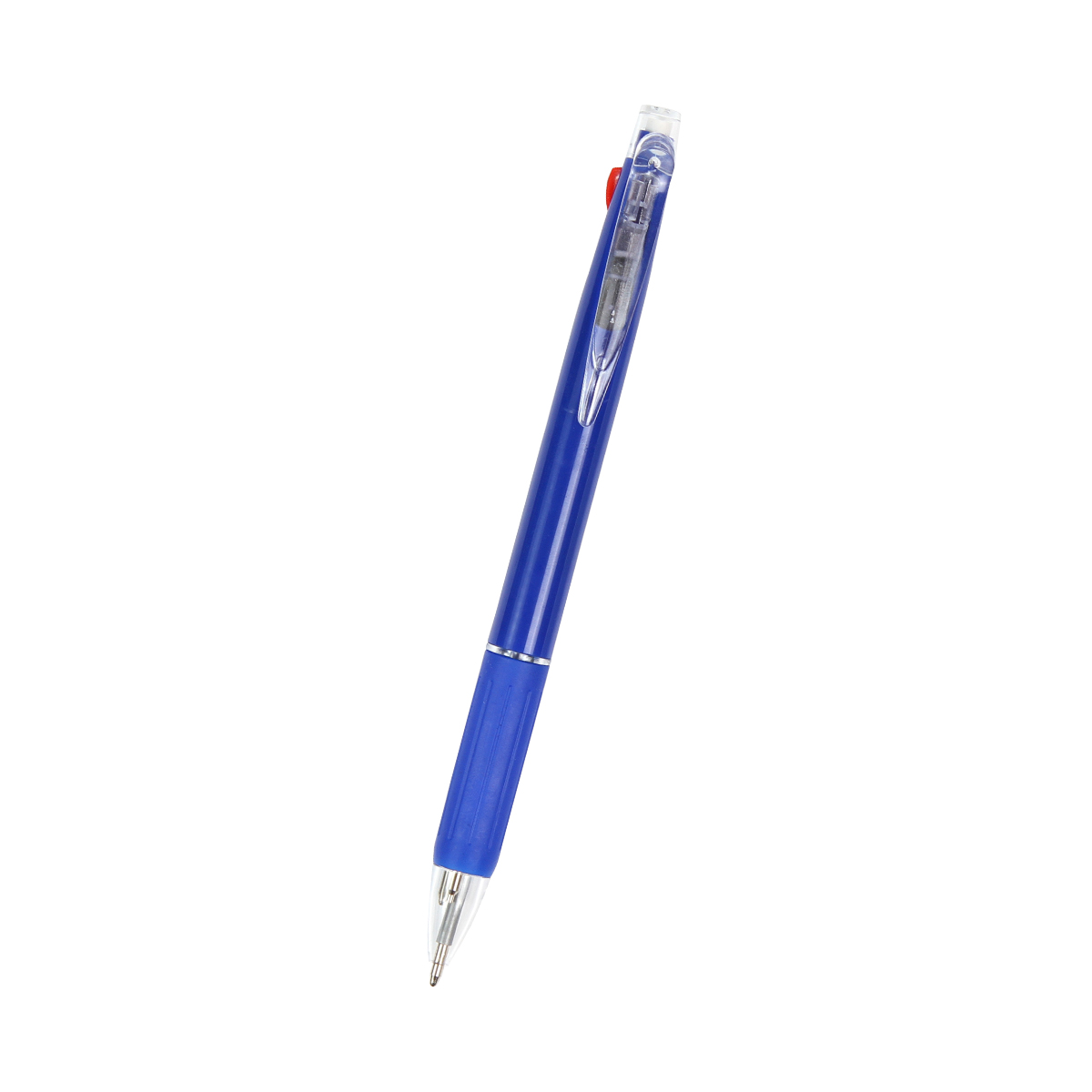 Bolígrafo Kumla. - Bolígrafo 3 en 1 fabricado en plástico ABS, tres tintas: azul, negra y roja, con clip de plástico transparente (que funciona para expulsar la punta color azul), con acción de empuje, parte superior y punta transparentes, empuñadura de goma de color.