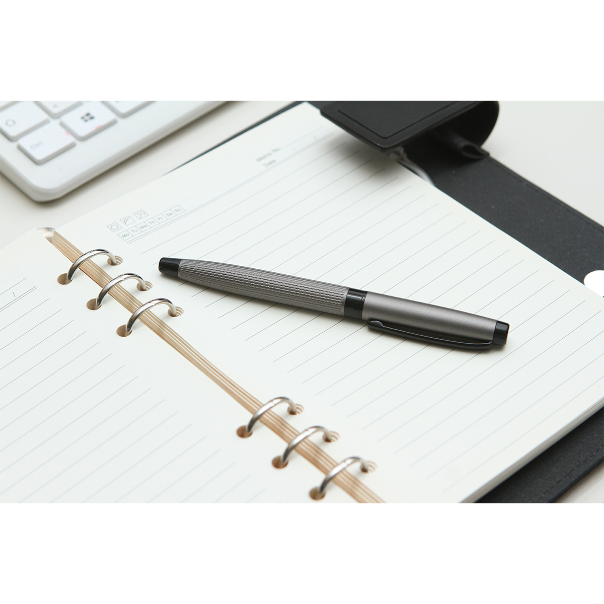 Bolígrafo Retiers. - Bolígrafo de con barril fabricado en acero inoxidable, con adornos en color negro, tipo roller pen, tinta de escritura negra. Incluye caja de regalo color negro.