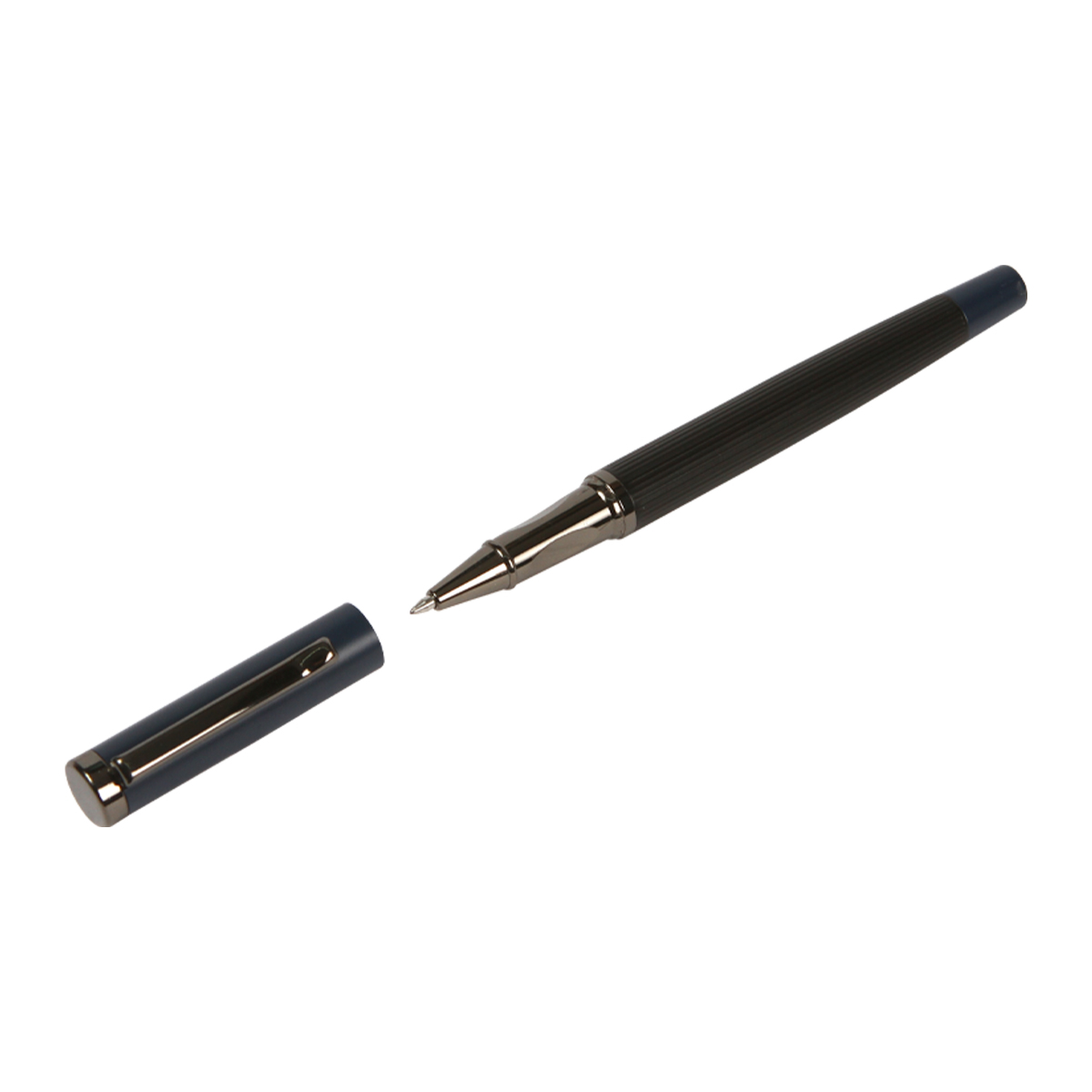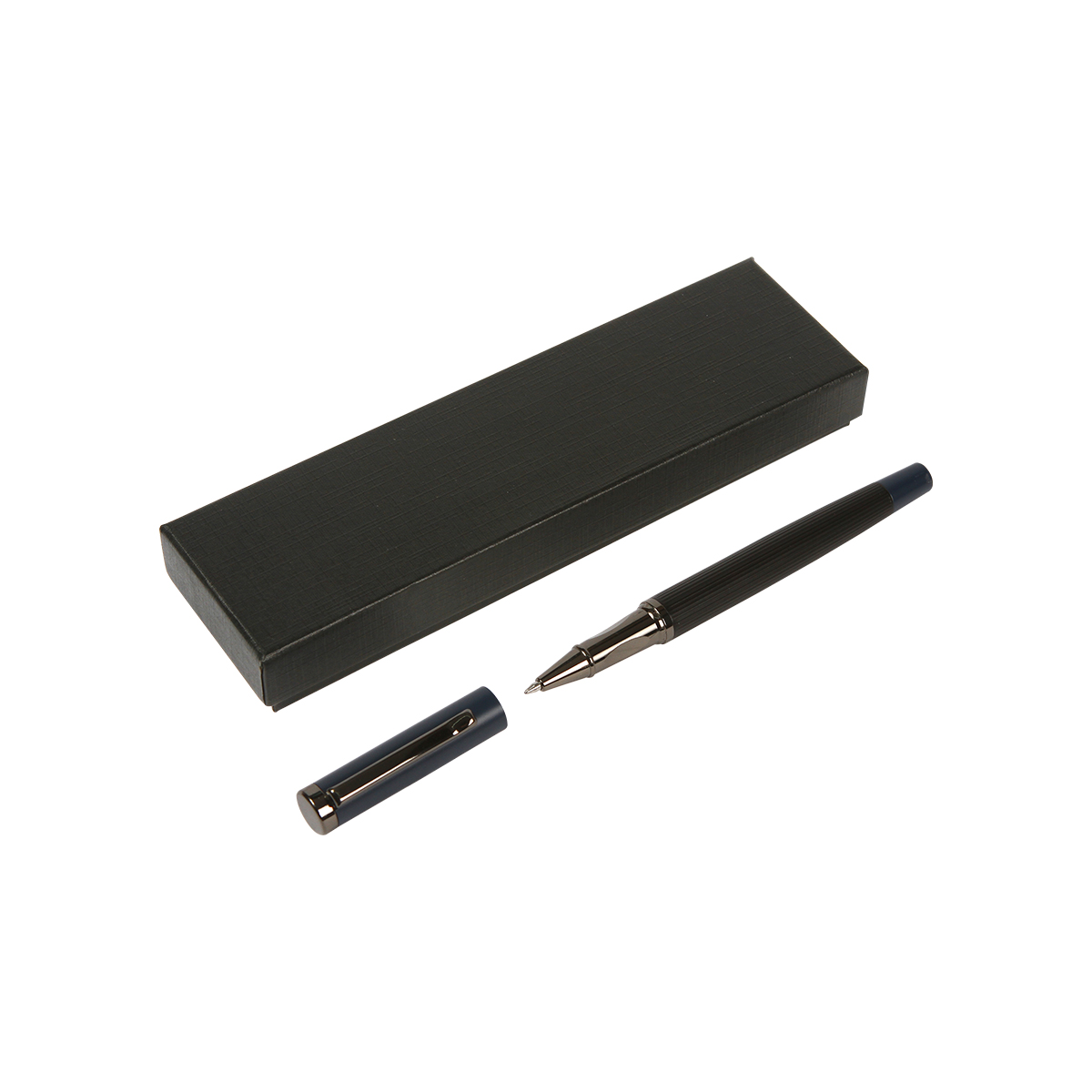 Bolígrafo Enfield. - Bolígrafo con barril fabricado en acero inoxidable, con detalles en color plateado, tipo roller. Tinta de escritura de gel color negro. Incluye caja de regalo color negro.