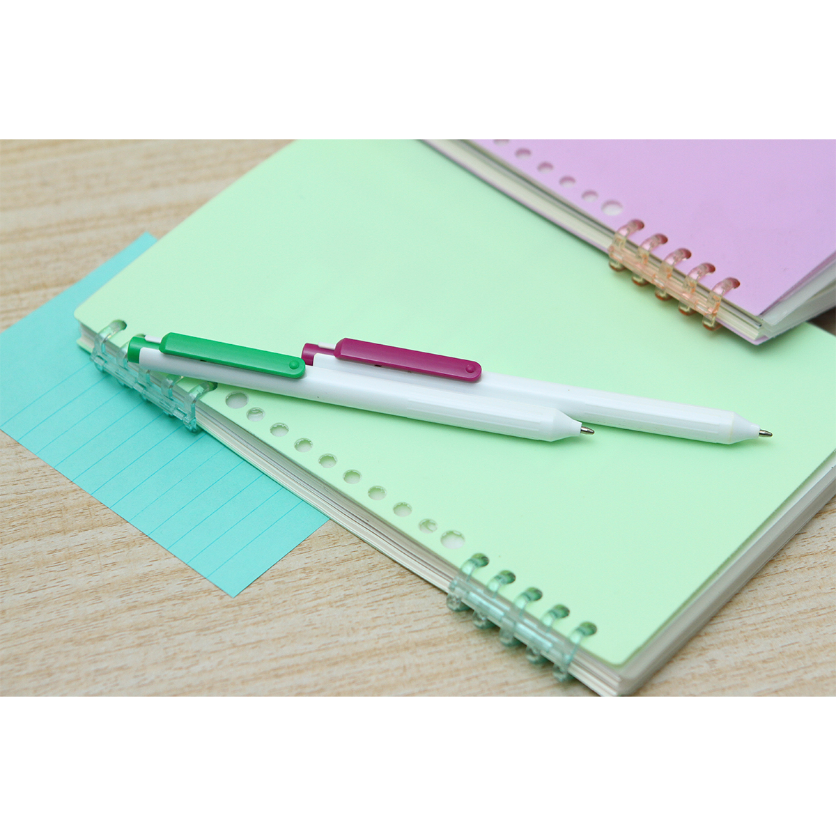 Bolígrafo Vaiges. - Bolígrafo con barril fabricado en plástico ABS color blanco y clip en diferentes colores a elegir, mecanismo de botón. Tinta de escritura negra.