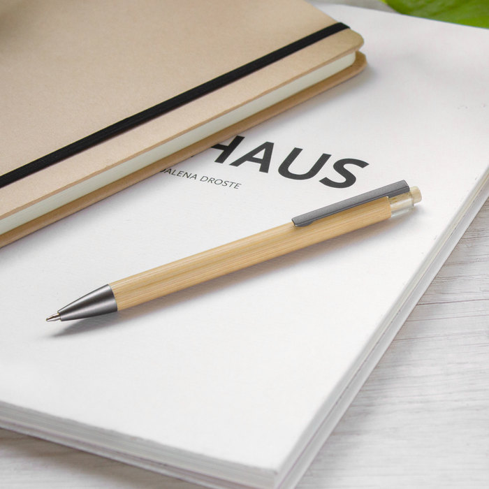 BUNGALO - Boligrafo de bambú, con botón, punta y clip metálico. Mecanismo de ...
