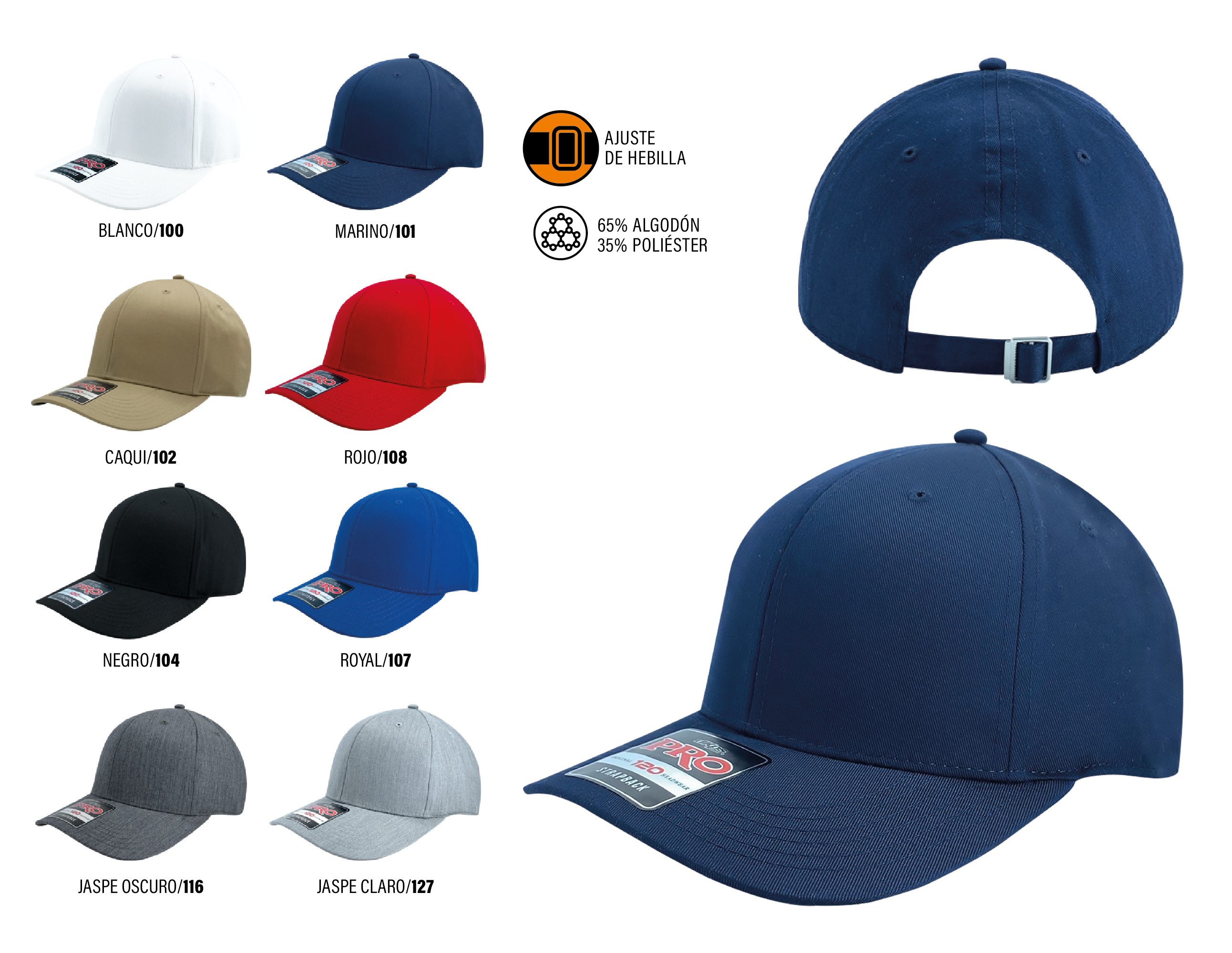 GORRA PRO 65% ALGODON 35% POLIESTER AJUSTE DE HEBILLA METALICA ROYAL
