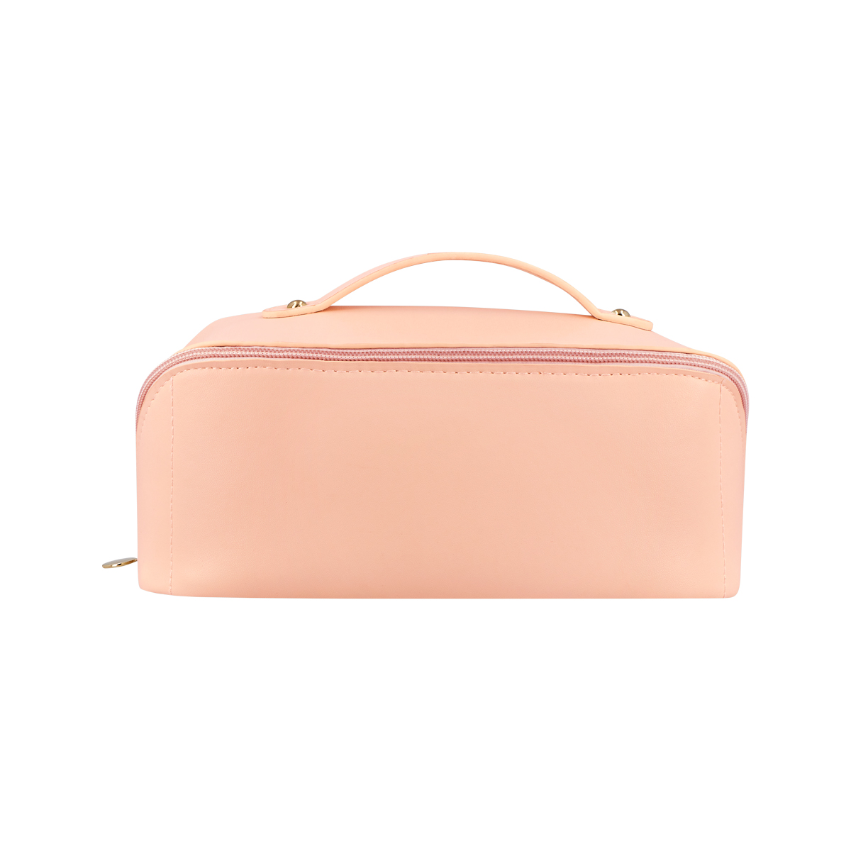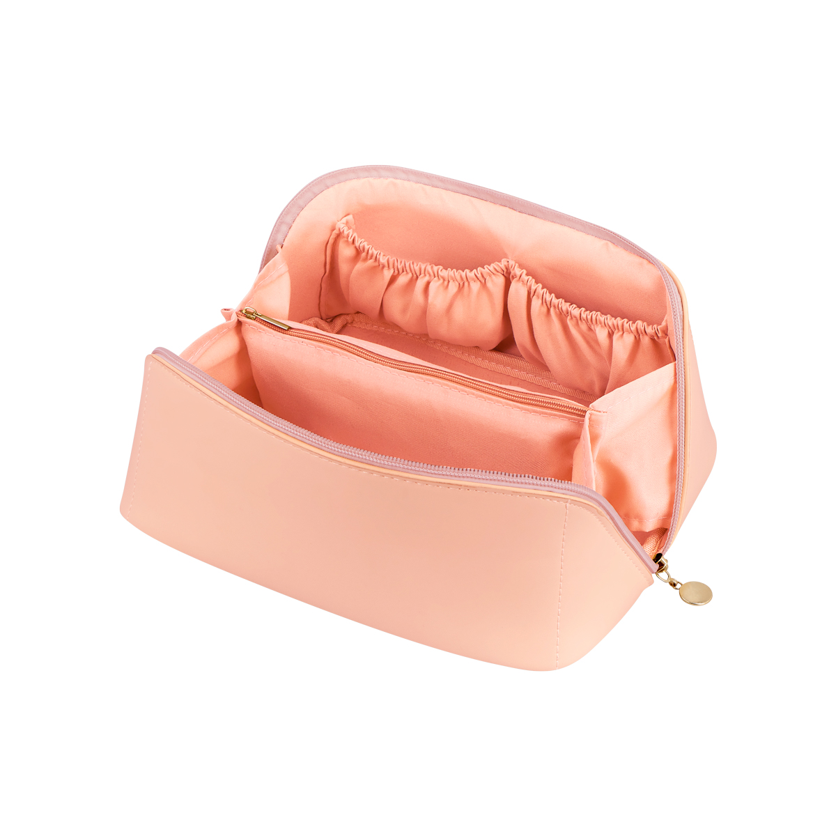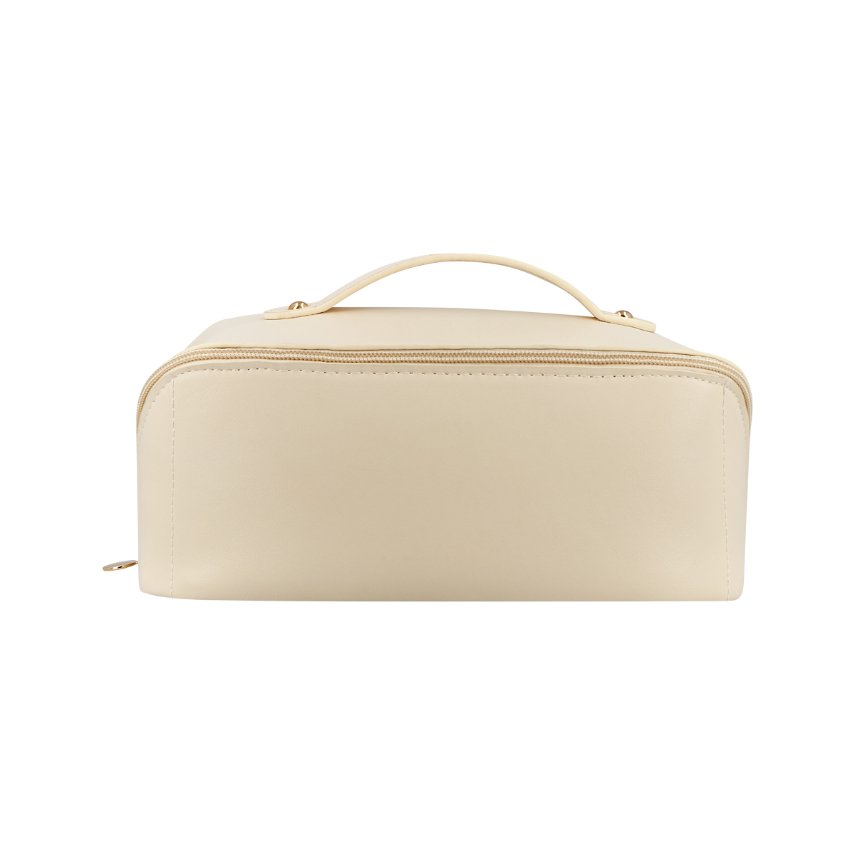 COSMETIQUERA TURA - Su elegante diseño en curpiel agrega un toque de sofisticación a tu rutina diaria, su cierre cruzado permite expandir la cosmetiquera al abrir, brindándote un fácil acceso a tus productos. En su interior, encontrarás tres elásticos organizadores que mantienen tus artículos en su lugar, evitando que se mezclen. Además, cuenta con un bolsillo central con cierre, ideal para guardar objetos más pequeños. Incluye un asa del mismo material, lo que facilita su transporte. Podrás llevar tus productos esenciales de belleza de manera ordenada, ya sea en casa o en tus viajes.