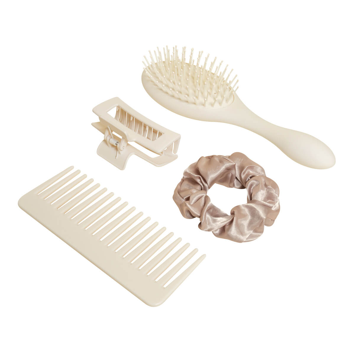 SET PARA CABELLO VLASY - Complementa tu rutina para el cuidado del cabello con este set que incluye 1 cepillo, 1 peine, 1 pinza y 1 dona. Cada accesorio, hecho con materiales suaves al tacto, se mantiene perfectamente ordenado dentro de su estuche de curpiel.