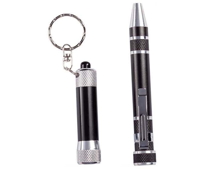 MATERIAL: Desarmador: Aluminio// Estuche: Cartón MEDIDAS: Desarmador: Ø 1.3 x 10.8 cm// Lámpara: Ø 1.3 x 6.5 cm// Estuche: 12.5 x 6 cm IMPRESION: TM SE GL MED. EMPAQUE: 32 x 28 x 23.5 cm PESO EMPAQUE: 10 kg PIEZAS EMPAQUE: 100
