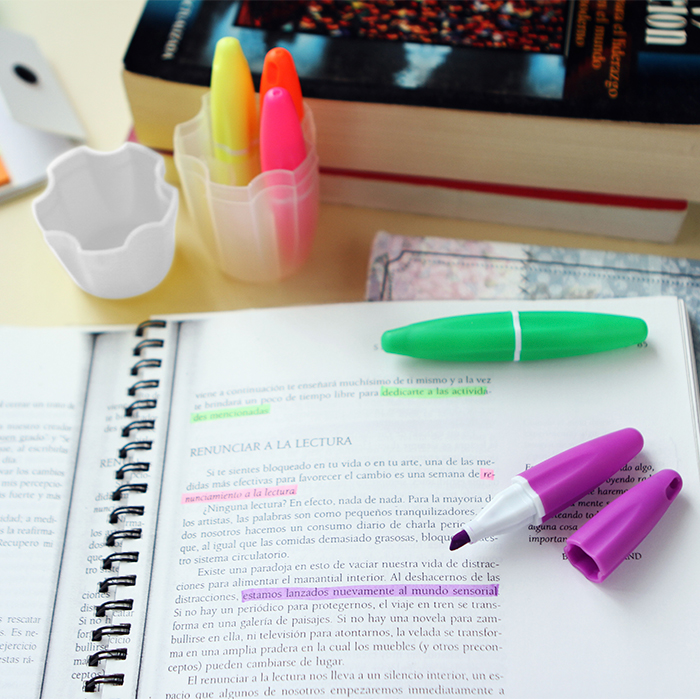 Set de marcadores Messina. - Juego de 5 marca textos de colores. Incluye un estuche de plástico color blanco translúcido que brinda protección y almacenamiento conveniente para tus marca textos.