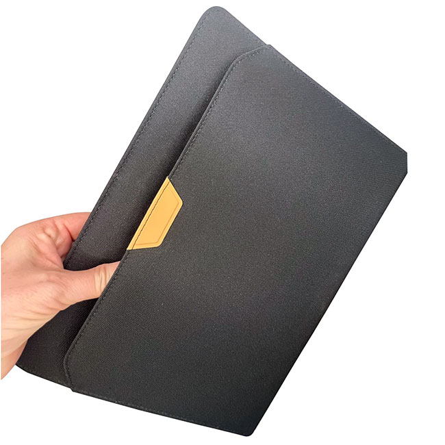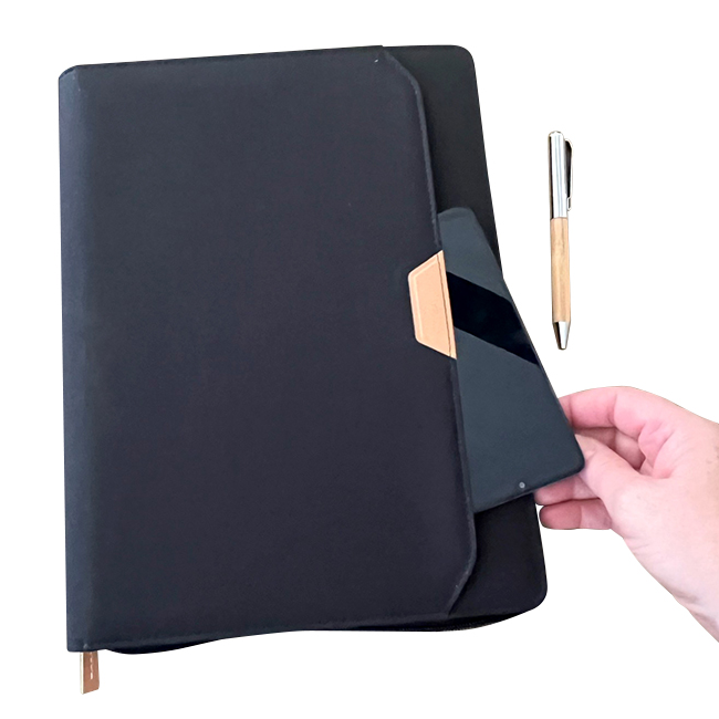 Porta Documentos Yakarta Porta Documentos Yakarta l Incluye block de hojas rayadas. l Interior con portabolígrafos y compartimentos organizadores l Cierre en zipper l Detalle de lengüeta al frente en curpiel l Colores: Gris y Negro. Material: PET reciclado Medida: 32 x 24 cm Impresión: Serigrafía Área de Impresión: 10 x 4 cm