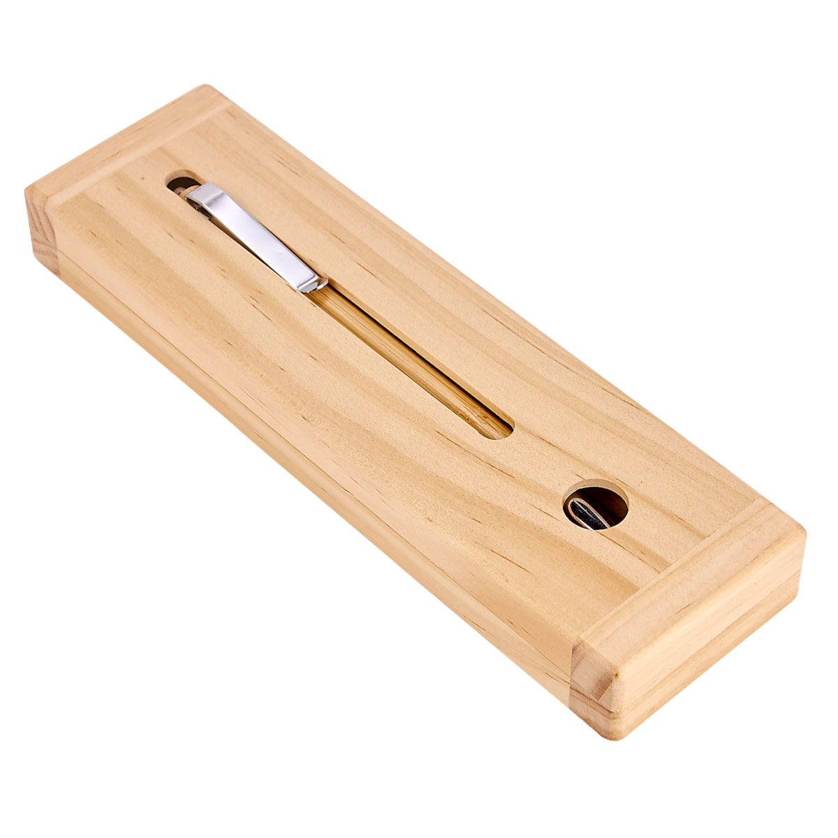 MATERIAL: Madera MEDIDAS: 1 x 13.6 cm Bolígrafo / 4.7 x 17.2 cm Estuche IMPRESION: Láser / Serigrafía MED. EMPAQUE: 44 x 37.5 x 39 cm PESO EMPAQUE: 47.36 Kg PIEZAS EMPAQUE: 256