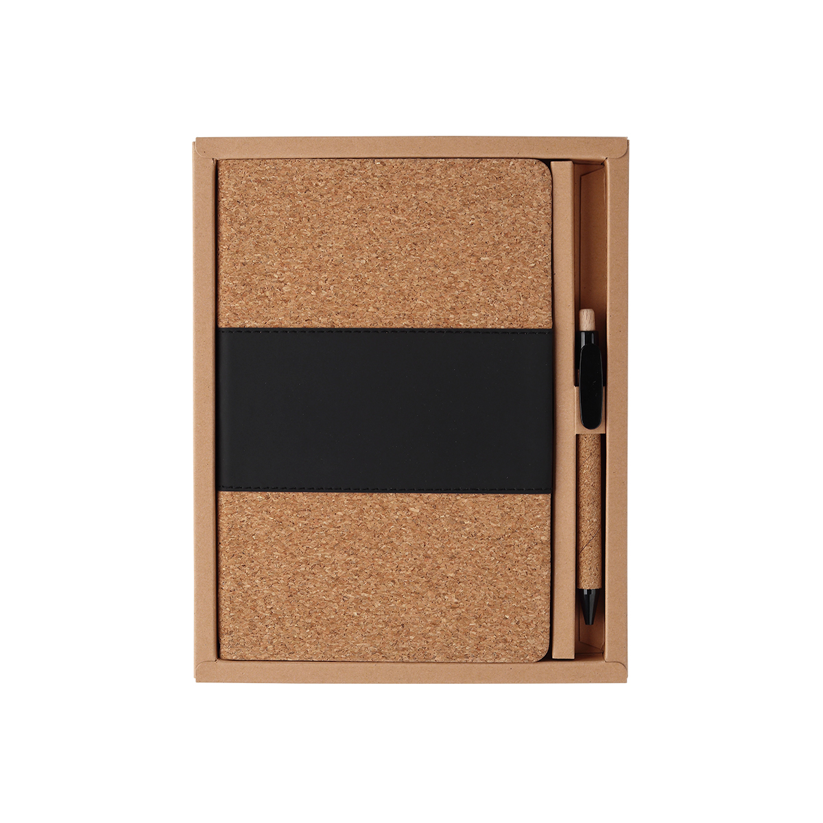 Set de libreta Delhi. - Set de libreta con pasta rígida de corcho y PU, 80 hojas rayadas de 70 g, separador de hojas y porta pluma; bolígrafo con barril de corcho, detalles en plástico y tinta de escritura negra. Incluye estuche de cartón individual. Tamaño A5.