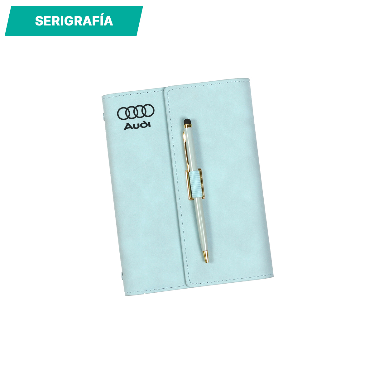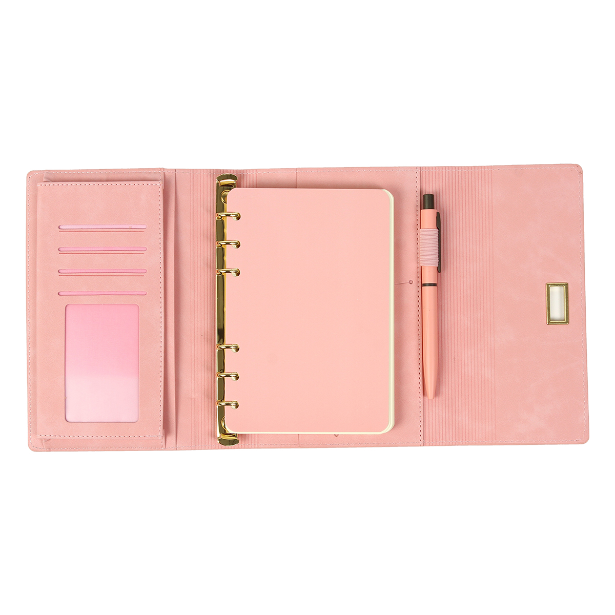 Carpeta Jinja. - Carpeta con exteriores en curpiel de alta calidad, con un diseño elegante y duradero. En su interior cuenta con 100 hojas removibles, aros en color dorado, espacio para tarjetas, documentos, y bolígrafo metálico a juego que ayuda a cerrar la carpeta. Incluye caja de cartón individual. Con este set de carpeta de curpiel y bolígrafo metálico a juego, tendrás todo lo necesario para organizarte y escribir de manera elegante.