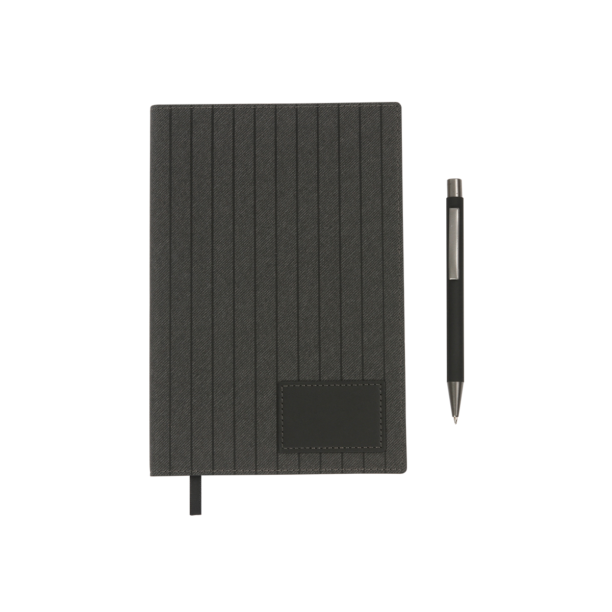 Set Mauron. - Set ejecutivo, incluye bolígrafo y libreta tamaño A5 con cubierta fabricada en PU (curpiel) con una etiqueta rectangular cosida en la esquina inferior derecha. Interior 135 hojas blancas de 80g. Incluye caja de regalo color negro.