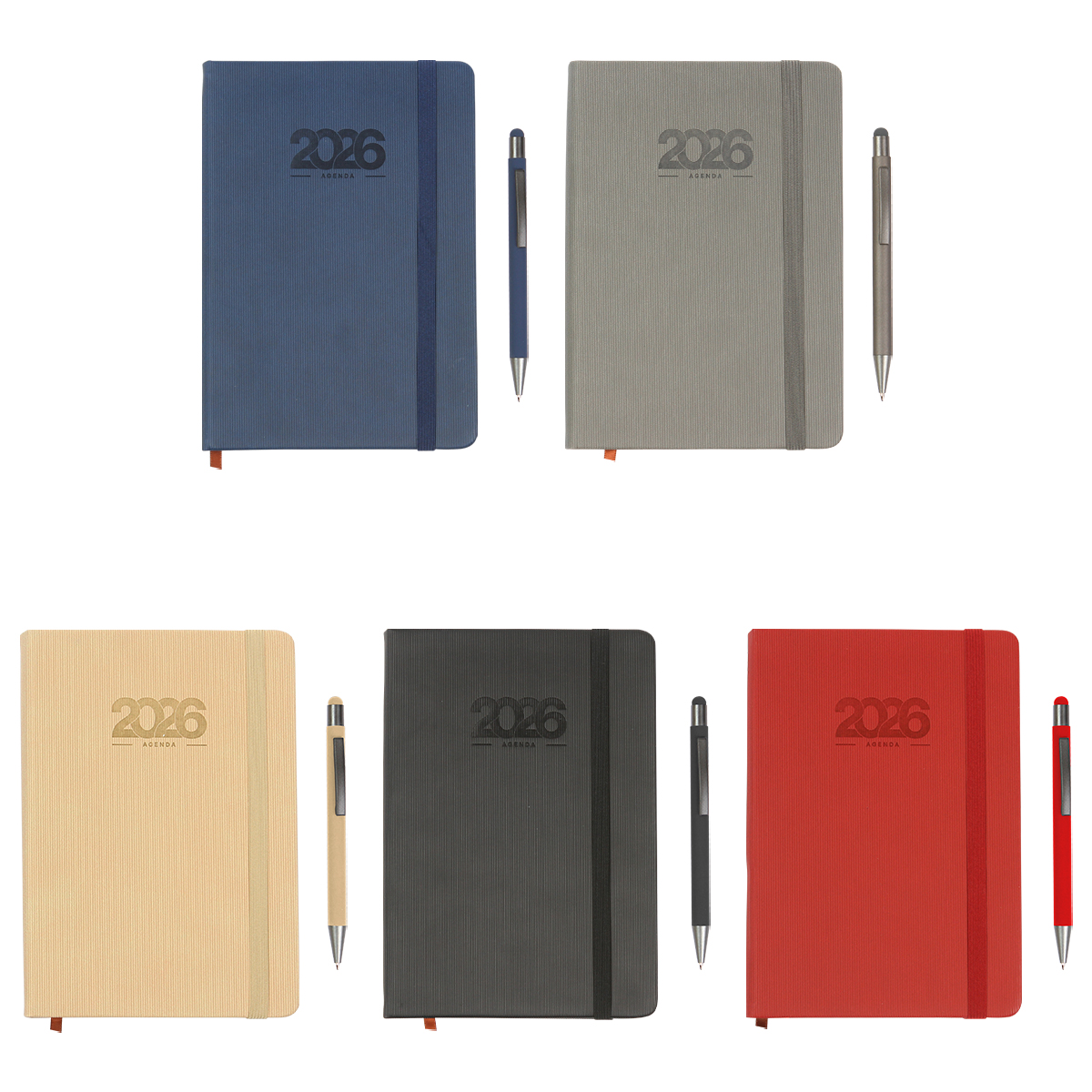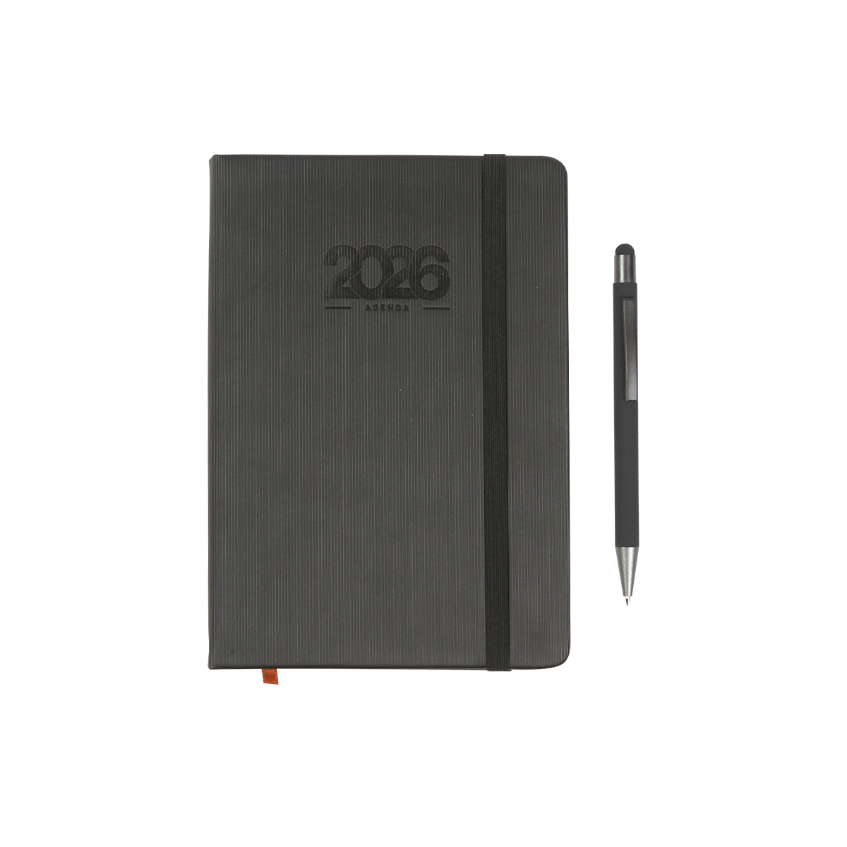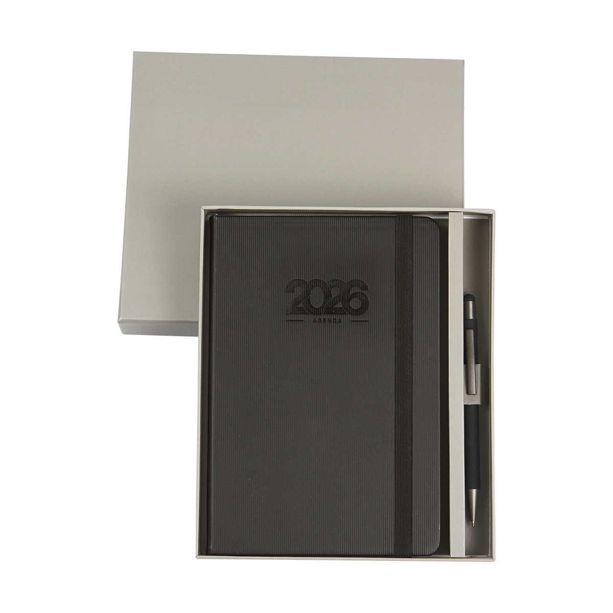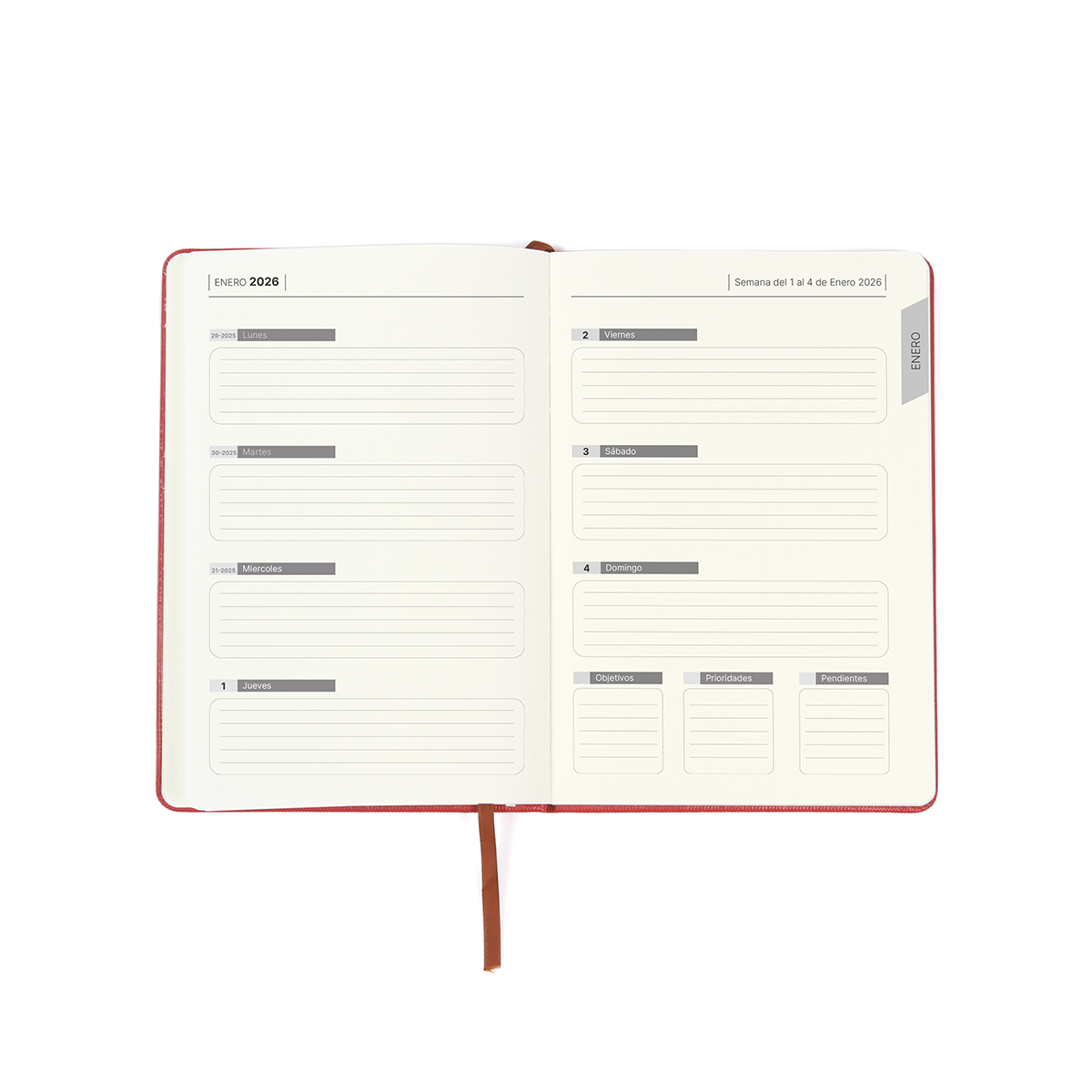 Agenda Semanal Batok. - Set de Agenda semanal 2026 con pluma y caja de regalo. Cubierta fabricada en curpiel (PU) con resorte sujetador e interior con 80 hojas de 65 g. Cada semana tiene espacio para tareas importantes y está organizada por horario (5:00 am - 22:00 pm). Cuenta con: Separador de hojas, Calendario anual 2025-2027, planeador mensual, hoja de objetivos anuales, hoja de pendientes mensuales, espacio para notas, tareas, sección de contactos y bolsillo interno para almacenar documentos. Incluye caja de cartón individual y bolígrafo con tinta de escritura negra.