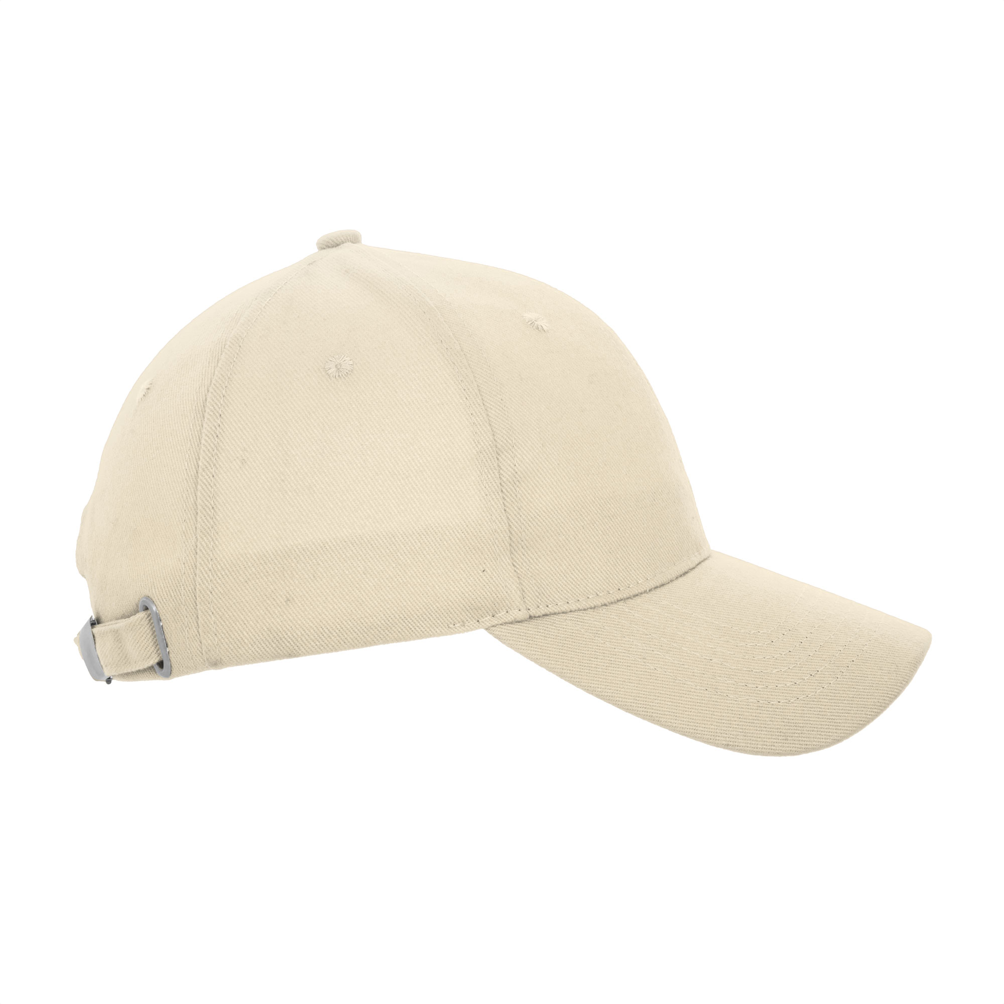 Gorra "JEVI" Gorra con visera. 6 paneles. Orificios de ventilación bordados. Botón forrado. Banda absorbente de poliéster. Cierre ajustable con hebilla metálica y banda deslizante