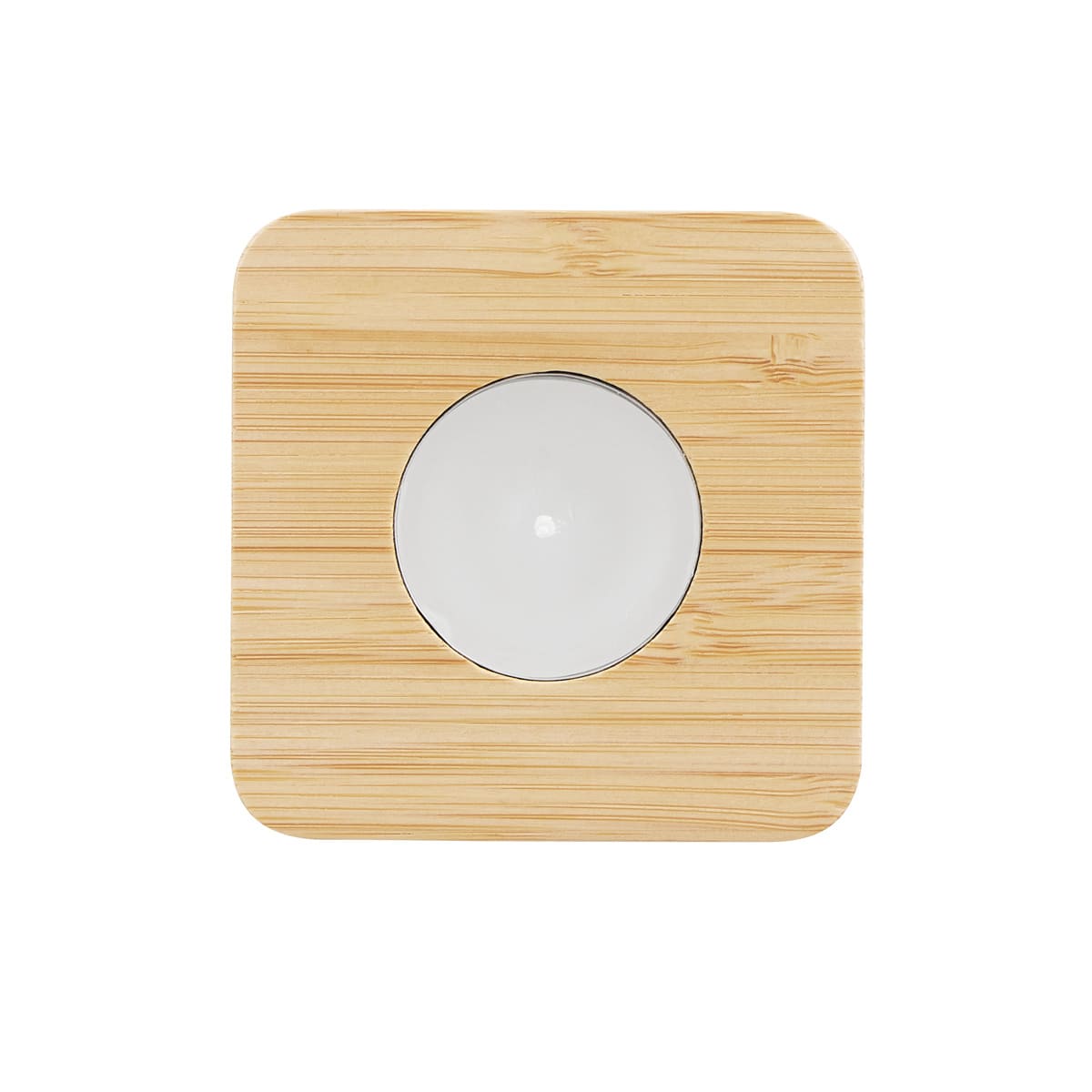 MATERIAL: Bambú / Parafina MEDIDAS: 7.8 x 7.8 x 2 cm IMPRESION: Serigrafía / Láser MED. EMPAQUE: 42 x 24 x 17 cm PESO EMPAQUE: 9 Kg PIEZAS EMPAQUE: 100
