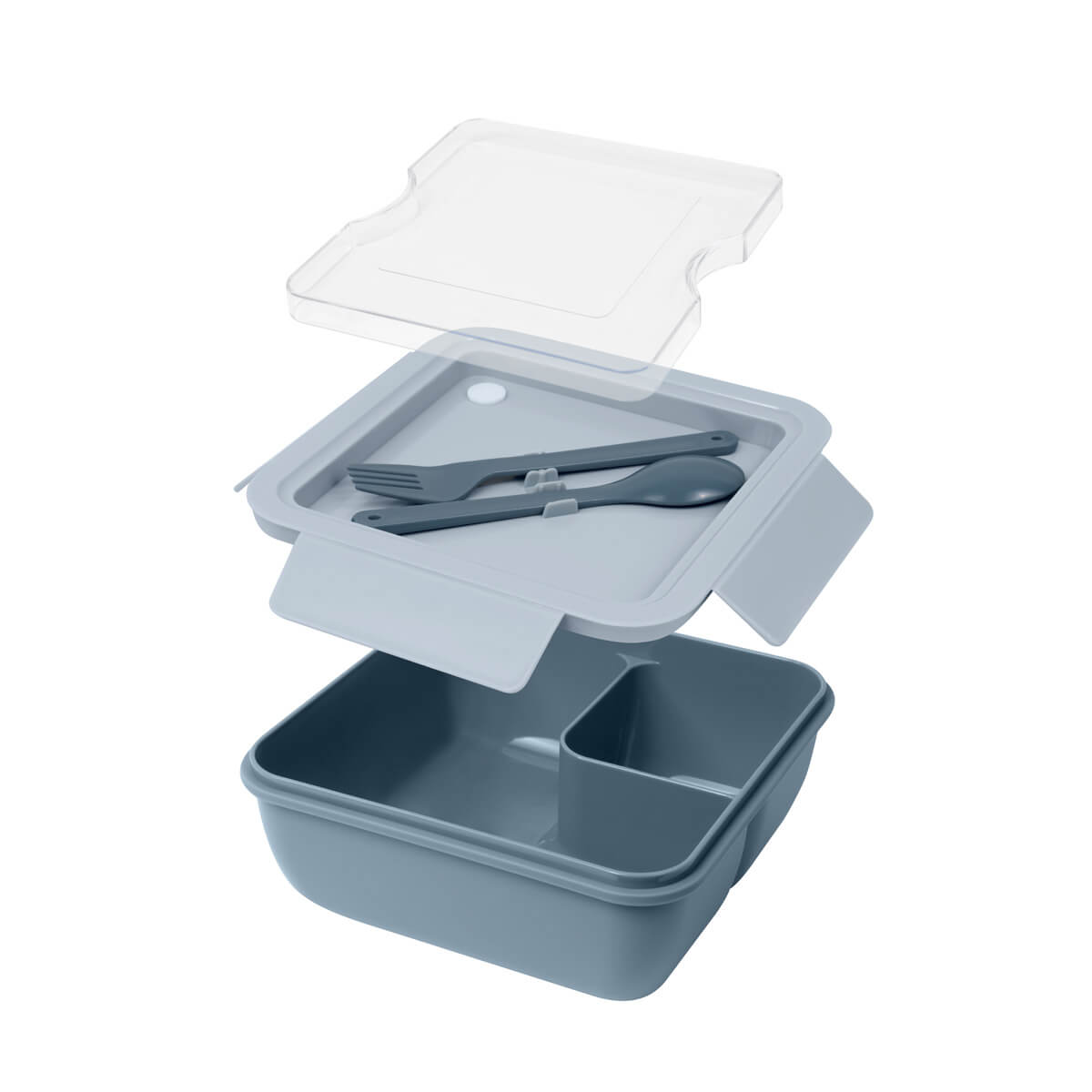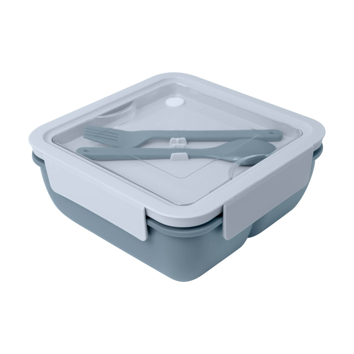 PORTAVIANDAS DIMITAR - Contenedor de alimentos compacto y versátil con divisor interno para mantener tus alimentos seguros y organizados. Tapa con cierre hermético de cuatro pestañas para evitar derrames. Sobre tapa con compartimento integrado que incluye un tenedor y una cuchara. Su innovador diseño, ofrece una solución práctica para transportar tus alimentos a cualquier lugar. Apto para microondas.