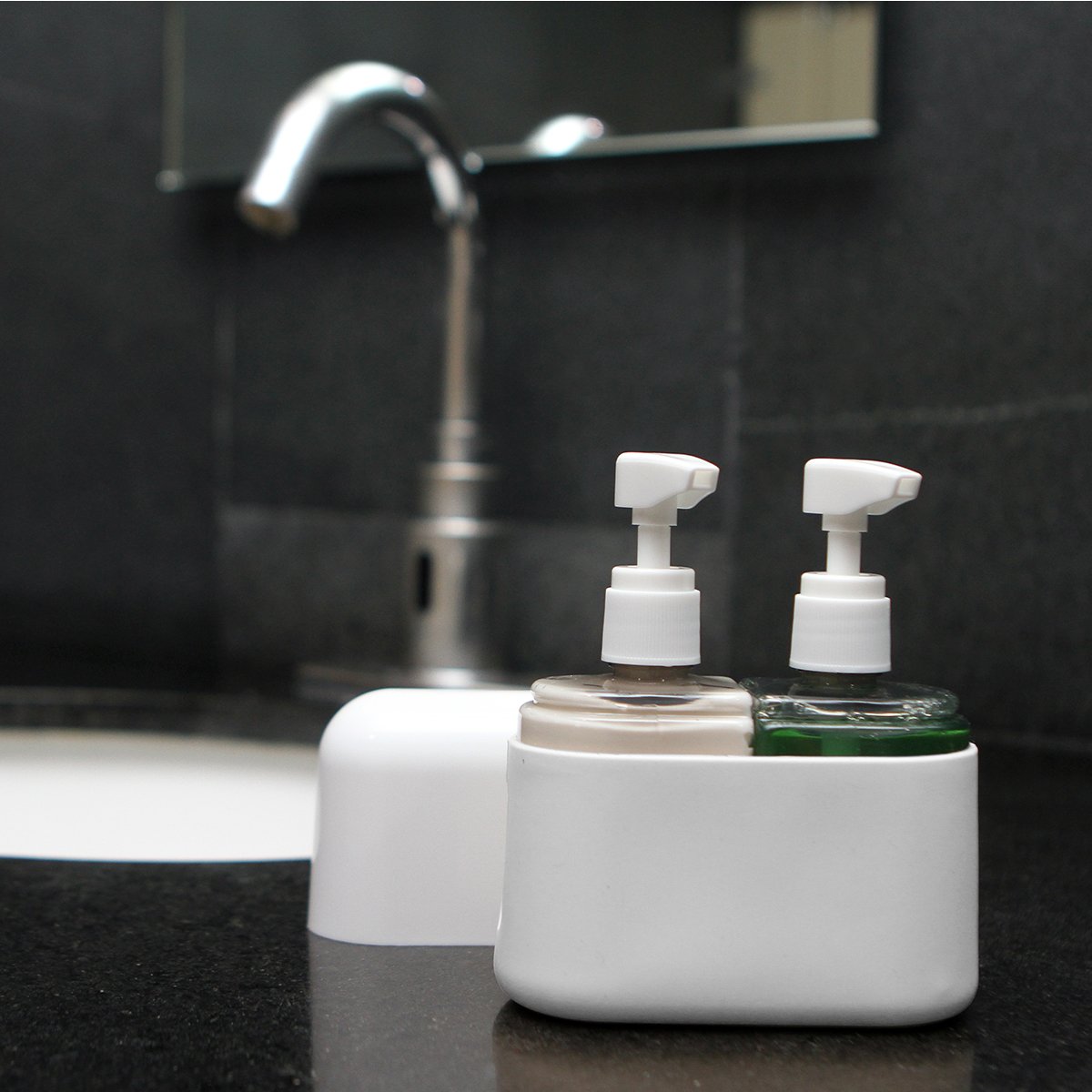 Set para jabón Makasar. - Set de 2 botellas para viaje, fabricadas en plástico PET y PP, con manga de silicón, tapa y dOSIFICADOR integrado para expulsar fácilmente el contenido, capacidad 100 ml cada una. Incluye caja de cartón individual. Ideal para llevarlo contigo siempre por su practico tamaño.