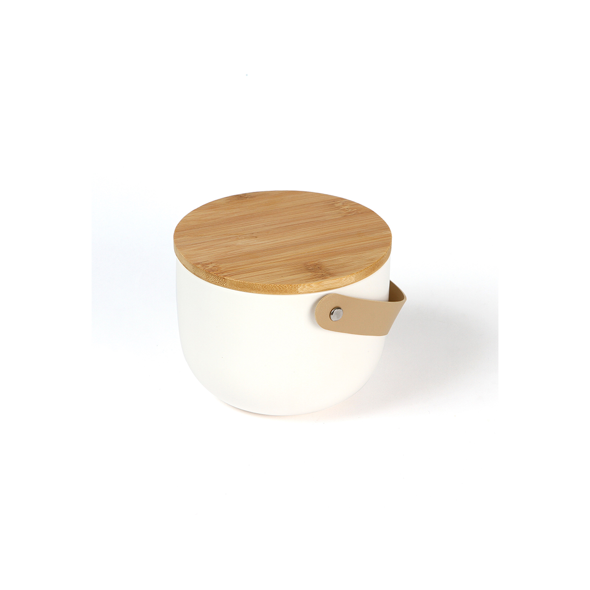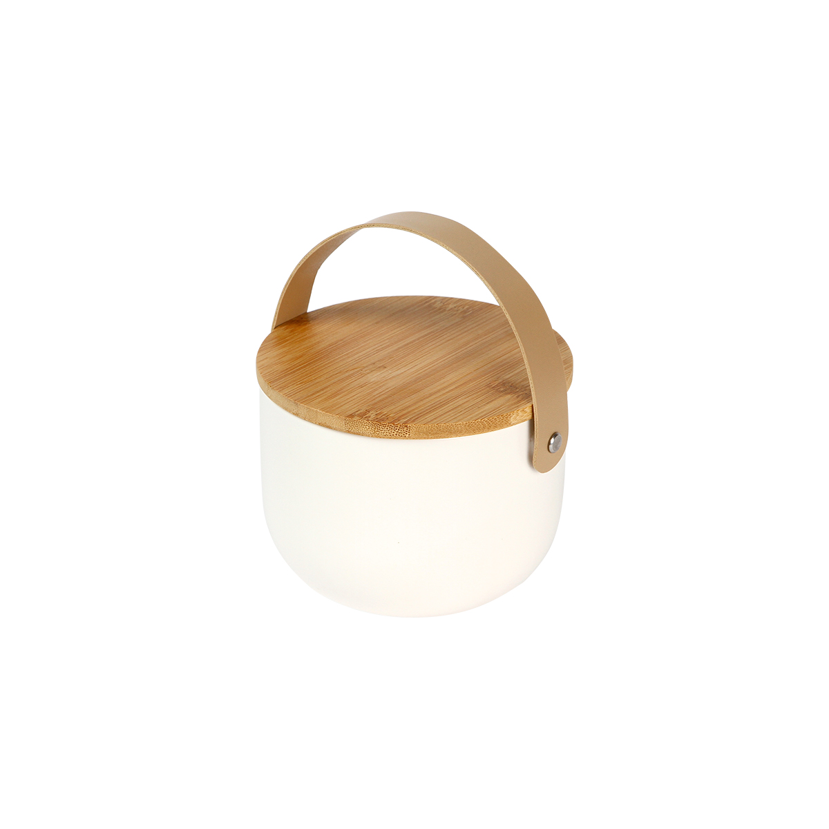 Vela Ladon. - Vela fabricada con cera de soja con esencia de limón y con contenedor de cerámica, su tapa de bambú le agrega un delicado detalle en madera que contrasta con el color blanco de la cerámica. Incluye una agarradera fabricada de curpiel. Su diseño sofisticado hace que sea ideal tanto para el uso en hogares como en ambientes profesionales como, oficinas o boutiques. Incluye caja de cartón individual.