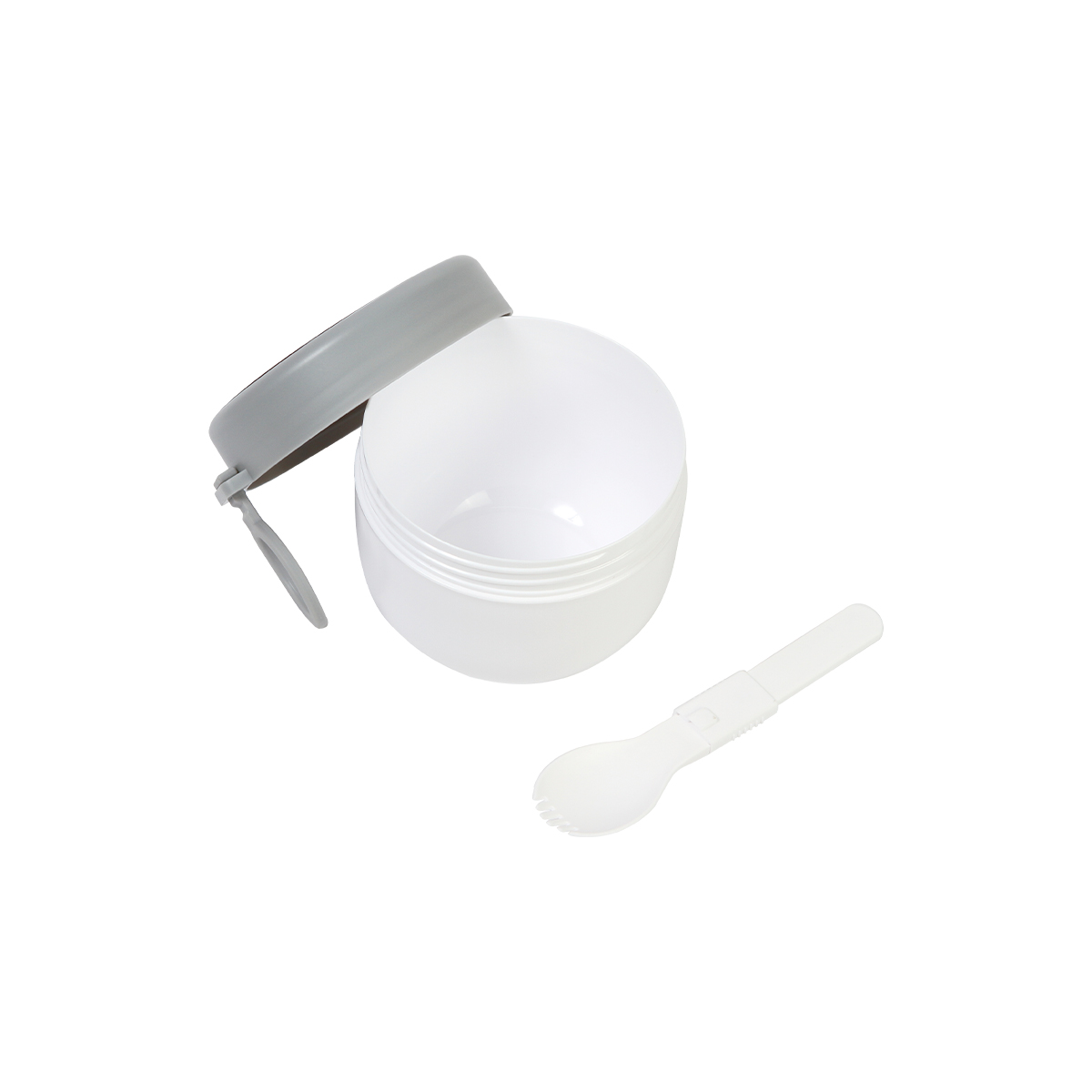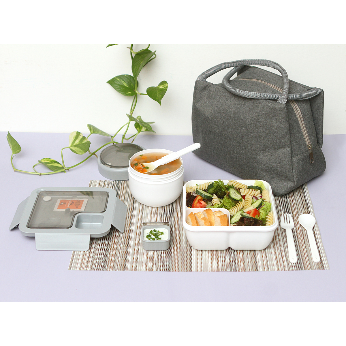 Incluye un contenedor de alimentos cuadrado con dos divisiones capacidad de 1100 ml, dos cubiertos y un recipiente pequeño para salsas o aderezos, y un contenedor más pequeño ideal para sopas o pastas de capacidad de 600 ml con un cubierto expansible