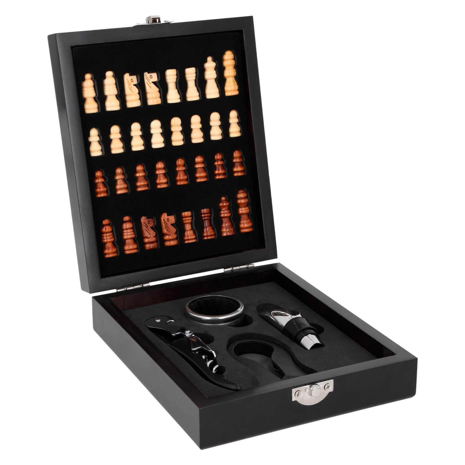 JAQUE Set de vinos con 4 accesorios: Sacacorchos, boquilla, corta gotas y corta etiquetas. Incluye ajedrez.
