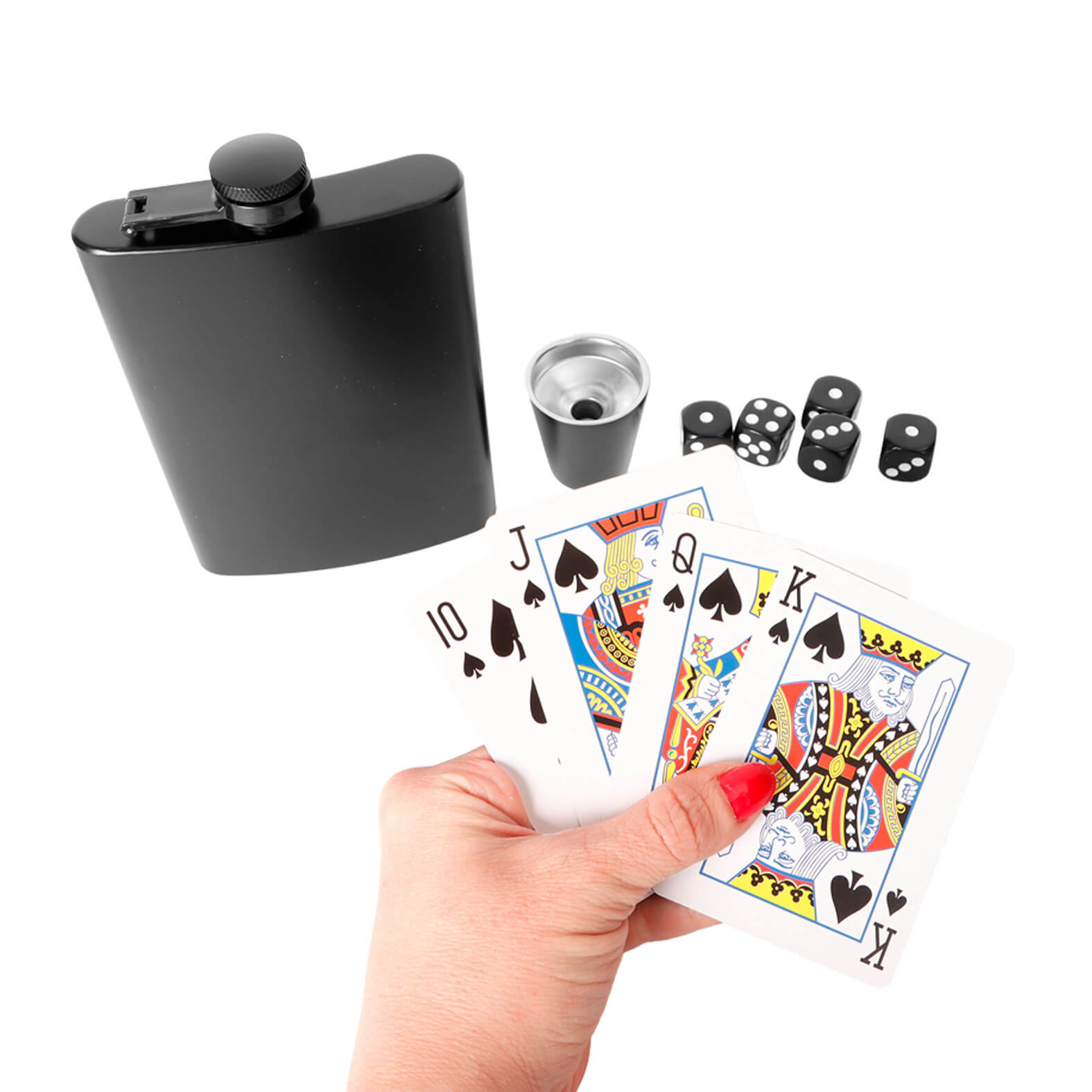 VELUTE Set de licorera con shot, mini embudo, 5 dados y juego de cartas.