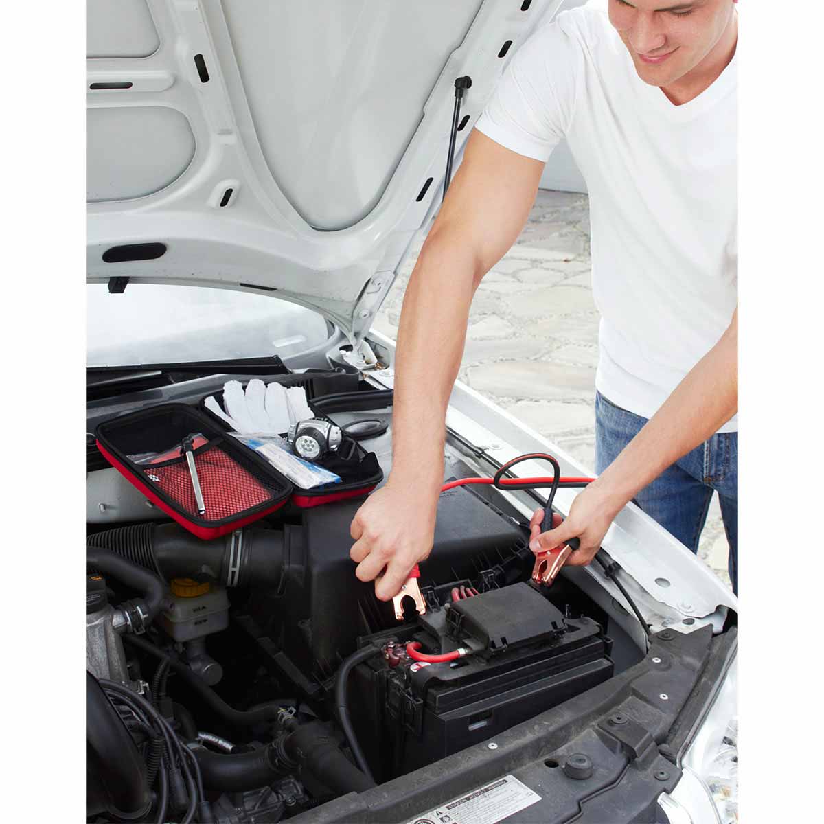 SET DE EMERGENCIA ANKER - Contiene cables pasa corriente (100 amp), medidor de presión de aire (50 psi), guantes, impermeable, vendas adheribles para proteger heridas, pinza, estuche y lámpara para cabeza con 7 LEDS, utiliza 3 baterías AAA (no incluidas).