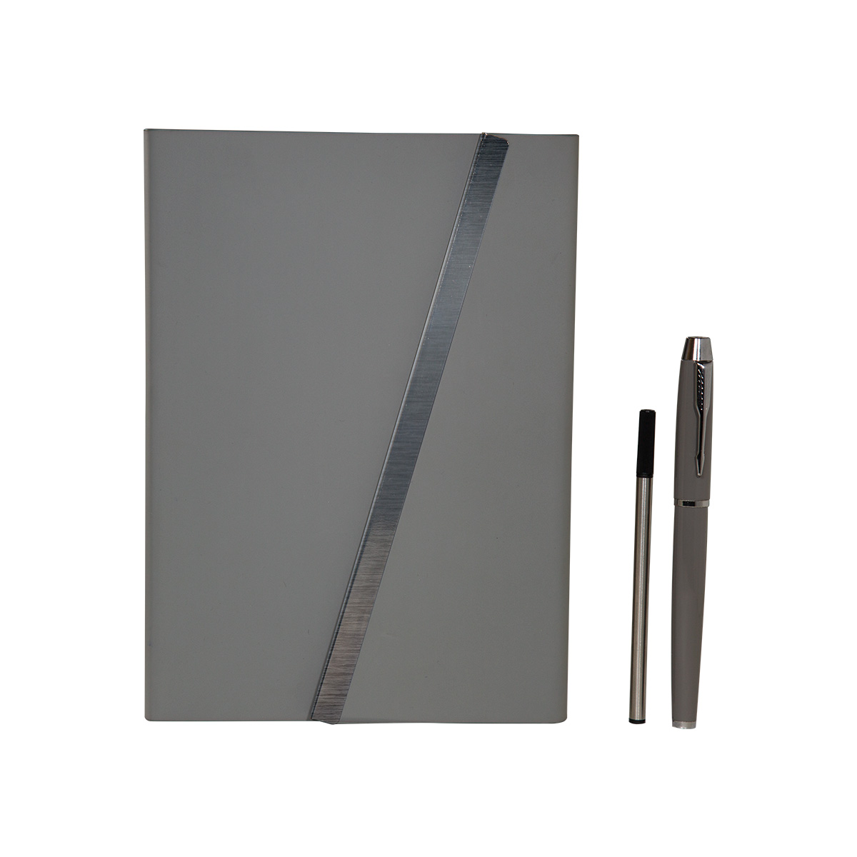 MATERIAL: Curpiel y Metal Libreta / Acero Inoxidable Bolígrafo MEDIDAS: 15 x 21 cm Libreta / 0.9 x 14 cm Bolígrafo IMPRESION: Láser y Termograbado en Libreta / Láser en bolígrafo MED. EMPAQUE: 50 x 26 x 45.5 cm PESO EMPAQUE: 3.06 Kg PIEZAS EMPAQUE: 20