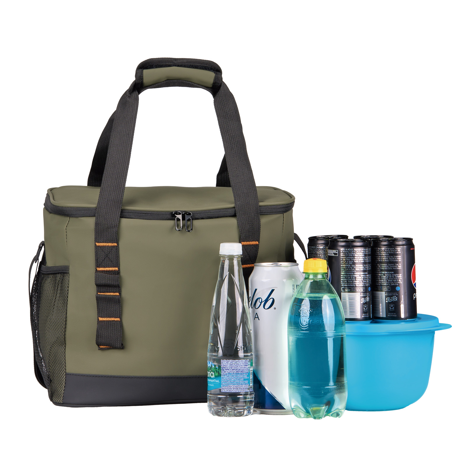 FUCA Hielera rectangular con interior impermeable plastificado con cierre, dos mallas laterales, asas con velcro y correa ajsutable.